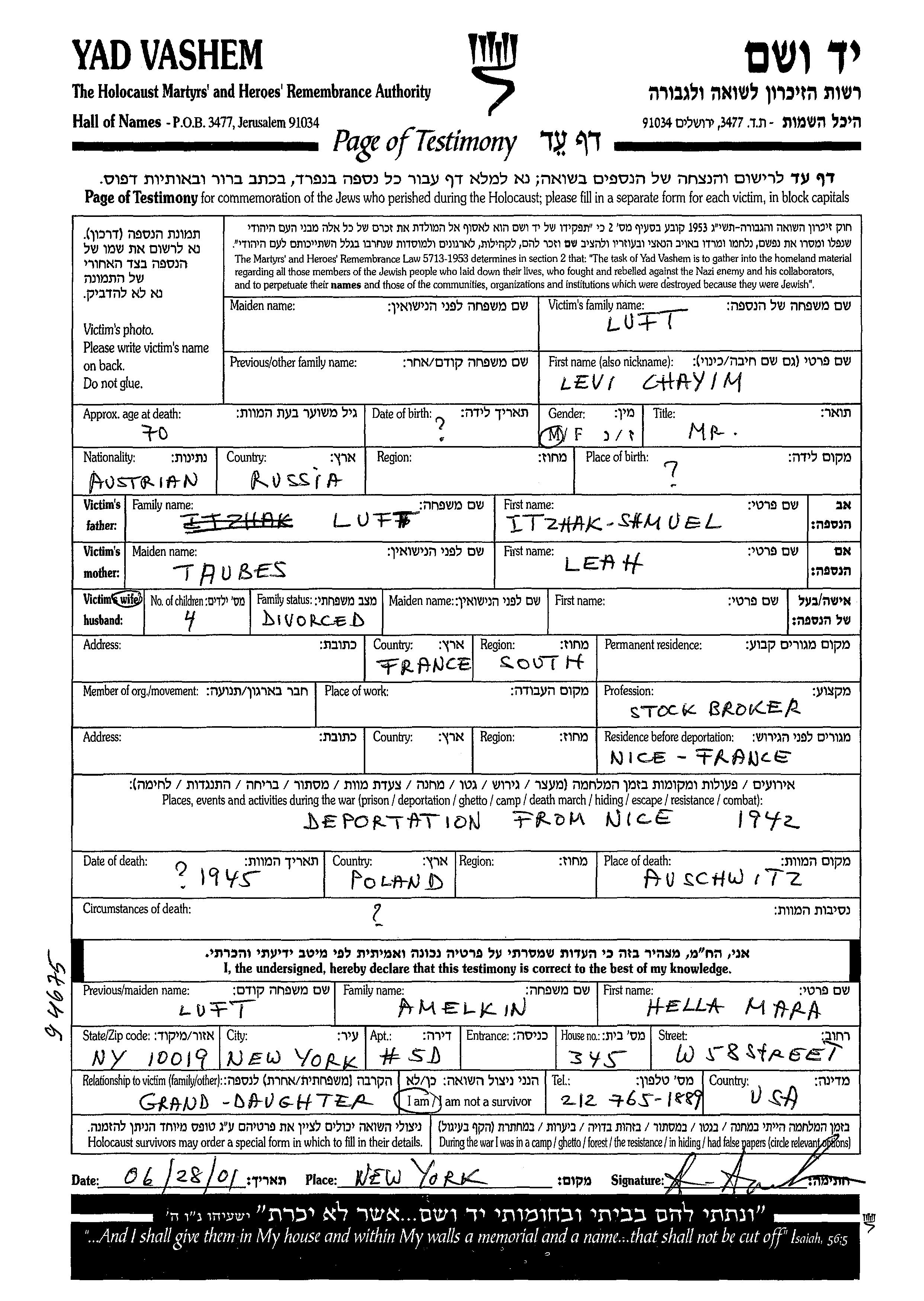 Levi Chayim Luft was born in Russia (USSR) to Itzhak Shmuel and Leah. He was a stockbroker and divorced. Prior to WWII he lived in France. During the war he was in Nice, France. Levi Chayim was murdered in the Shoah. Place of death: Auschwitz, Poland, 1945.