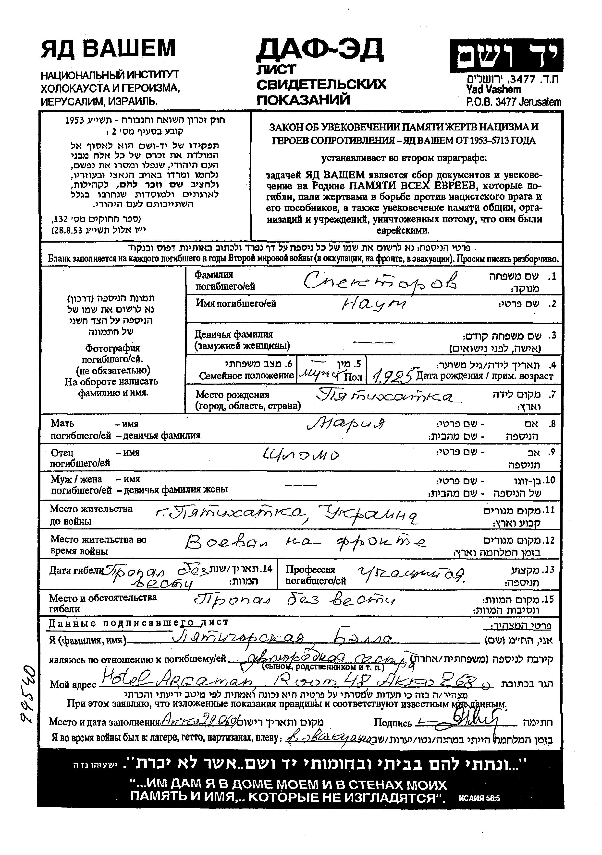 Naum Spektorov was born in Pyatikhatka, Ukraine (USSR), 1925 to Shlomo and Mariya. He was single. Prior to WWII he lived in Pyatikhatka, Ukraine (USSR). During the war he was in the Soviet armed forces. Naum was murdered in the Shoah.