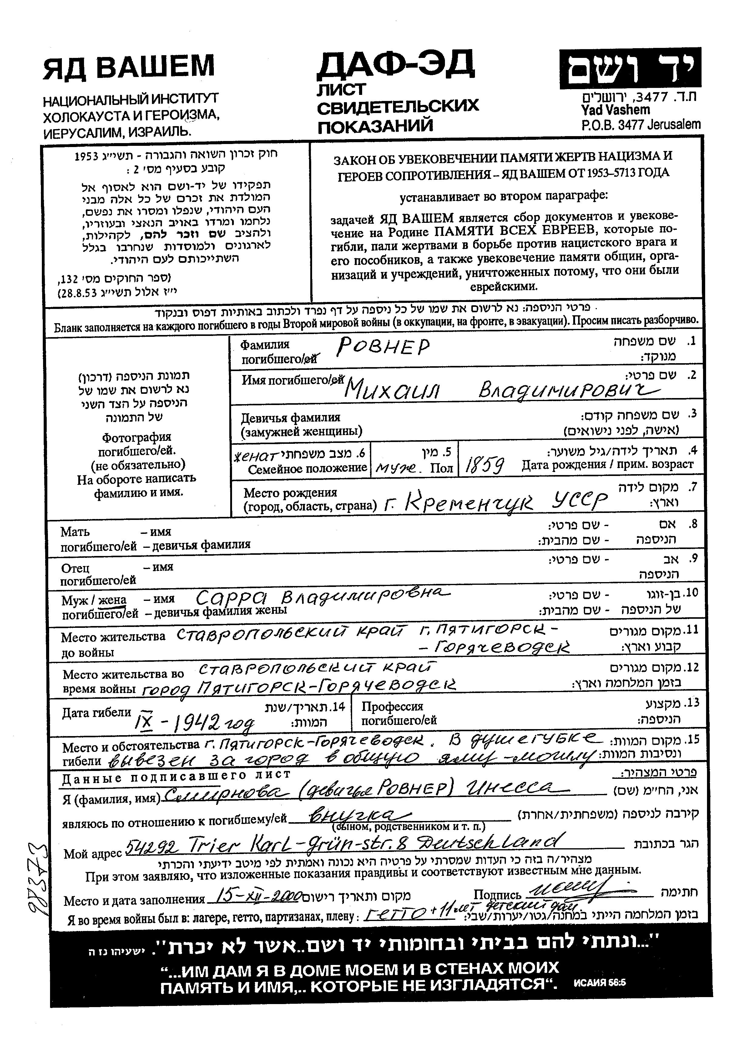 Mikhail Rovner was born in Kremenchug, Ukraine (USSR), 1859 to Vladimir. He was married to Sarra. Prior to WWII he lived in Goryachevodskiy, Russia (USSR). During the war he was in Goryachevodskiy, Russia (USSR). Mikhail was murdered in the Shoah. Place of death: Goryachevodskiy, Russia (USSR), 1942.