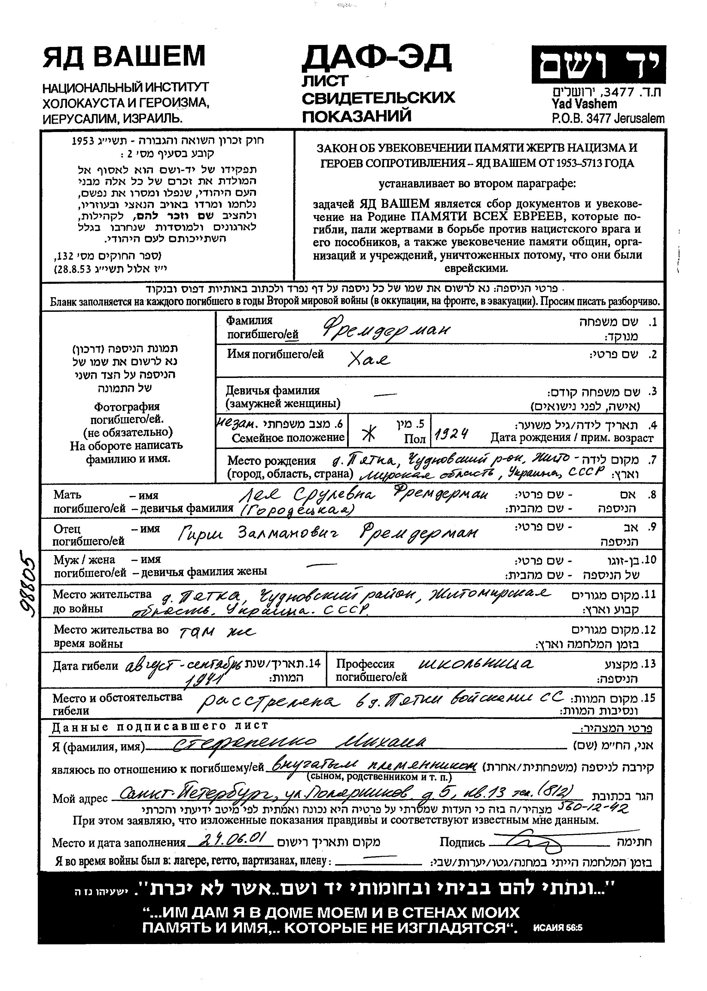 Khaia Fremderman was born in Pyatka, Ukraine (USSR), 1924 to Girsh and Leya. She was a pupil and single. Prior to WWII she lived in Pyatka, Ukraine (USSR). During the war she was in Pyatka, Ukraine (USSR). Khaia was murdered in the Shoah. Place of death: Pyatka, Ukraine (USSR), 1941.