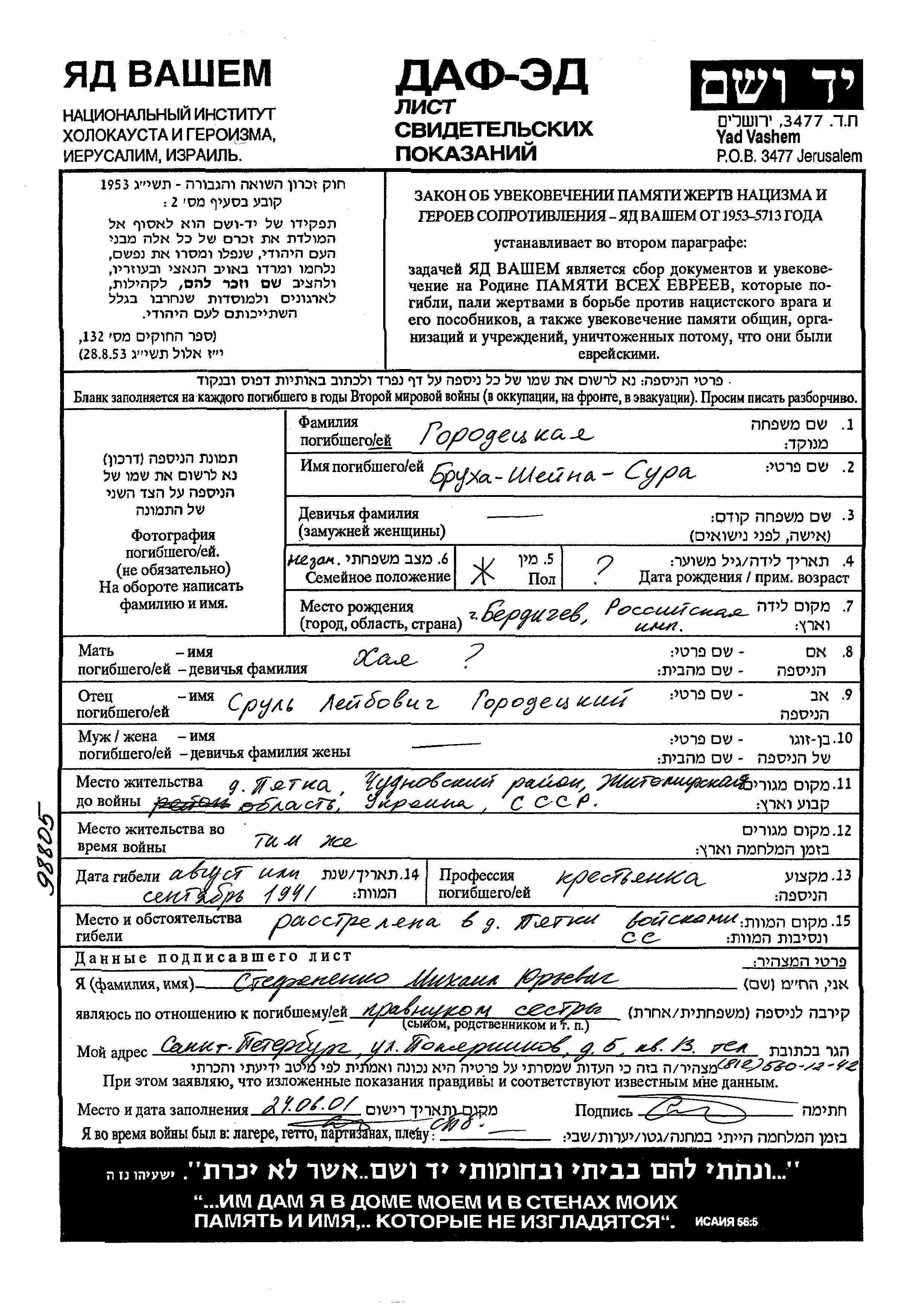 Brukha Sura Sheina Gorodetzkaya was born in Berdichev, Ukraine (USSR) to Srul and Khaia. She was a krestyanka and single. Prior to WWII she lived in Pyatka, Ukraine (USSR). During the war she was in Pyatka, Ukraine (USSR). Brukha Sura Sheina was murdered in the Shoah. Place of death: Pyatka, Ukraine (USSR), 1941.
