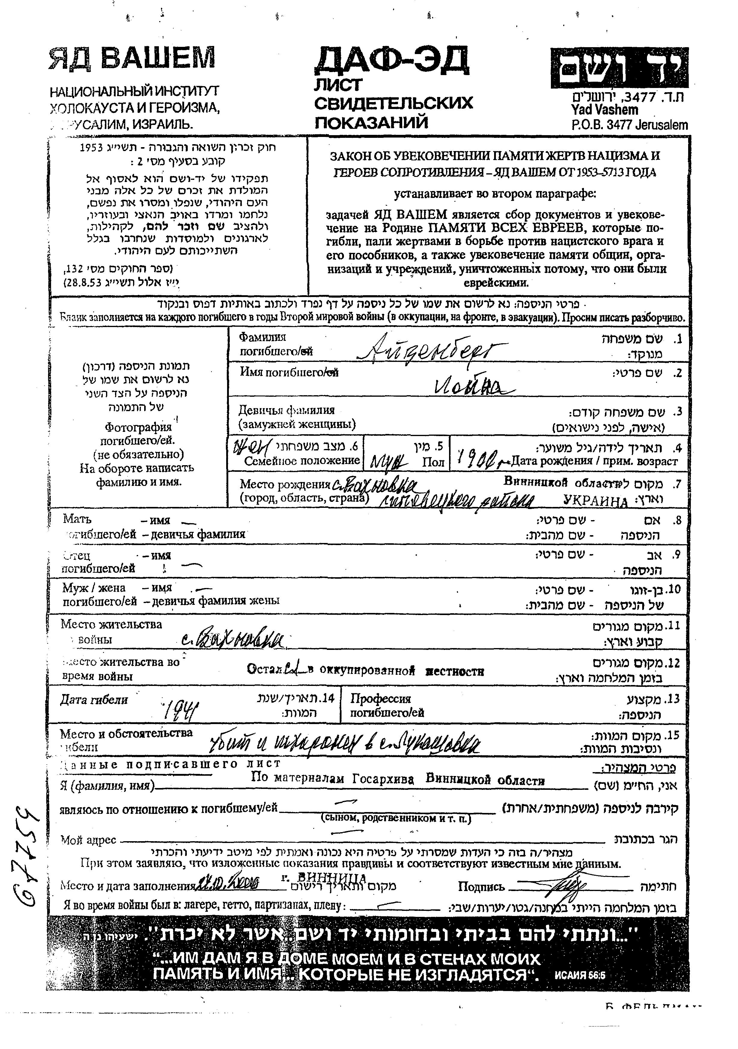 Aizenberg Loika 1909 Vakhnovka, Ukraine (USSR) Page of Testimony