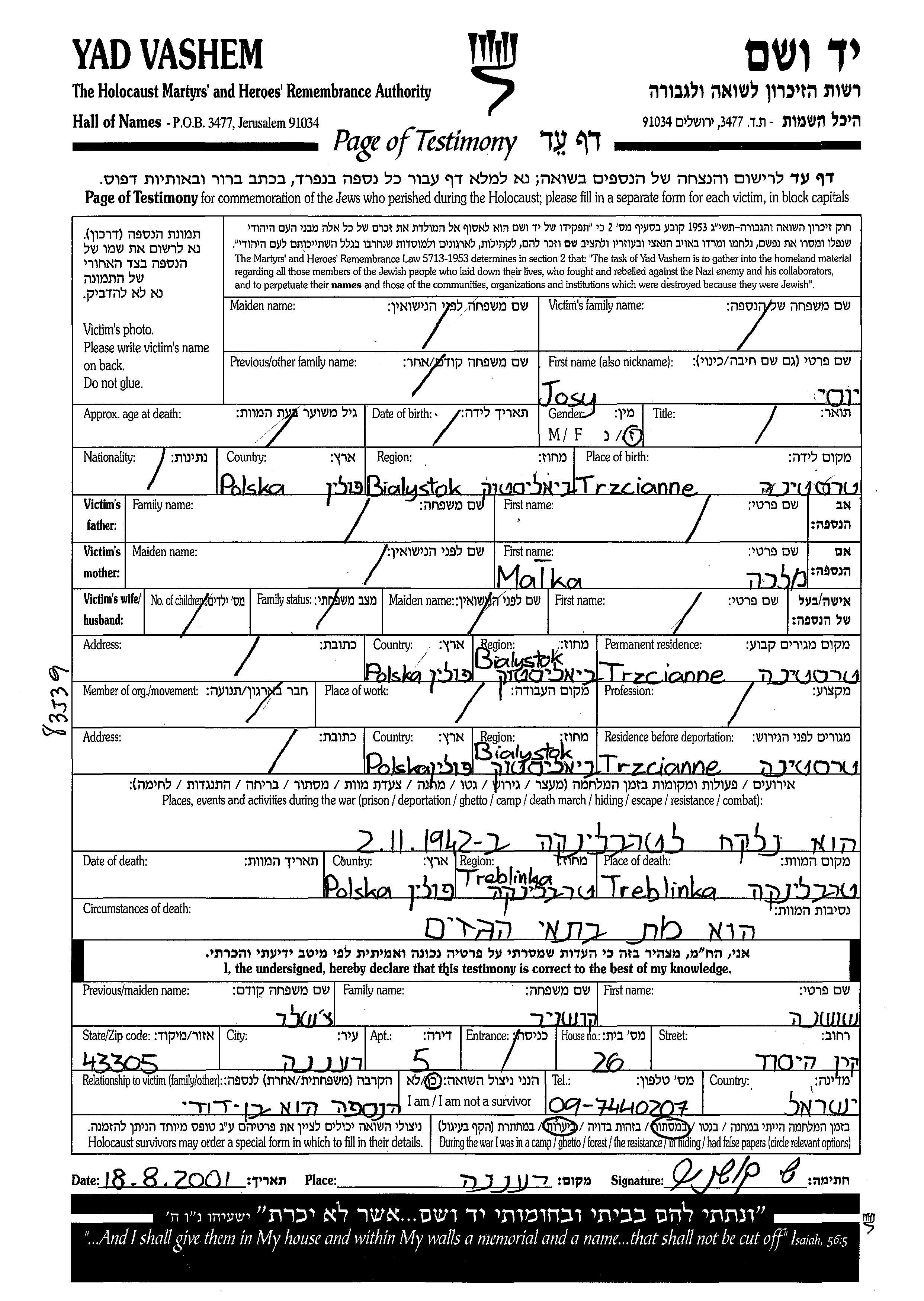Josy Surname unknown was born in Trzcianne, Poland to Malka. Prior to WWII he lived in Trzcianne, Poland. During the war he was in Trzcianne, Poland. Josy was murdered in the Shoah. Place of death: Treblinka, Poland, 1942.