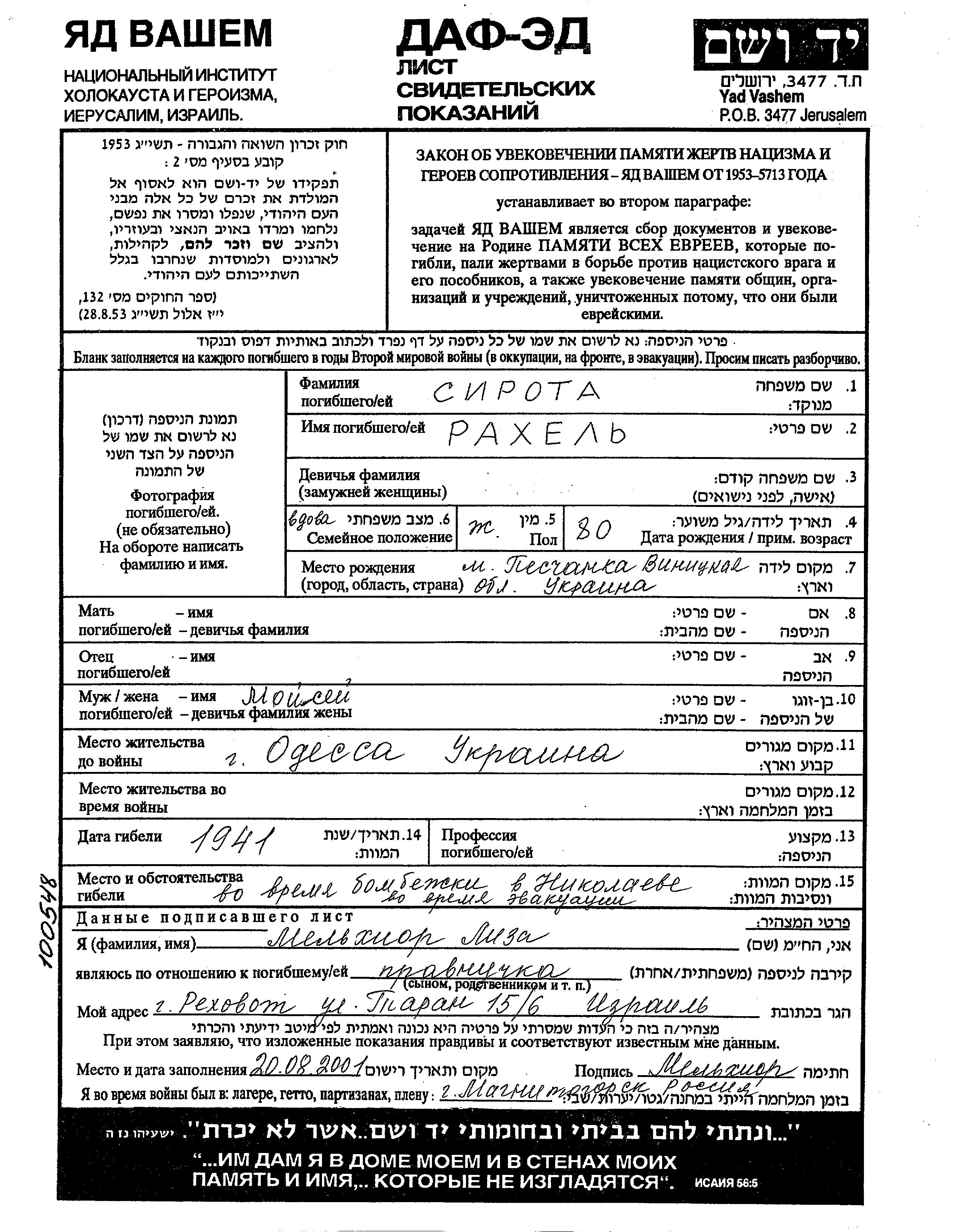 Rakhel Sirota was born in Peschanka, Ukraine (USSR). She was a widow of Moisey. Prior to WWII she lived in Odessa, Ukraine (USSR). Rakhel was murdered in the Shoah. Place of death: Nikolayev, Ukraine (USSR), 1941.