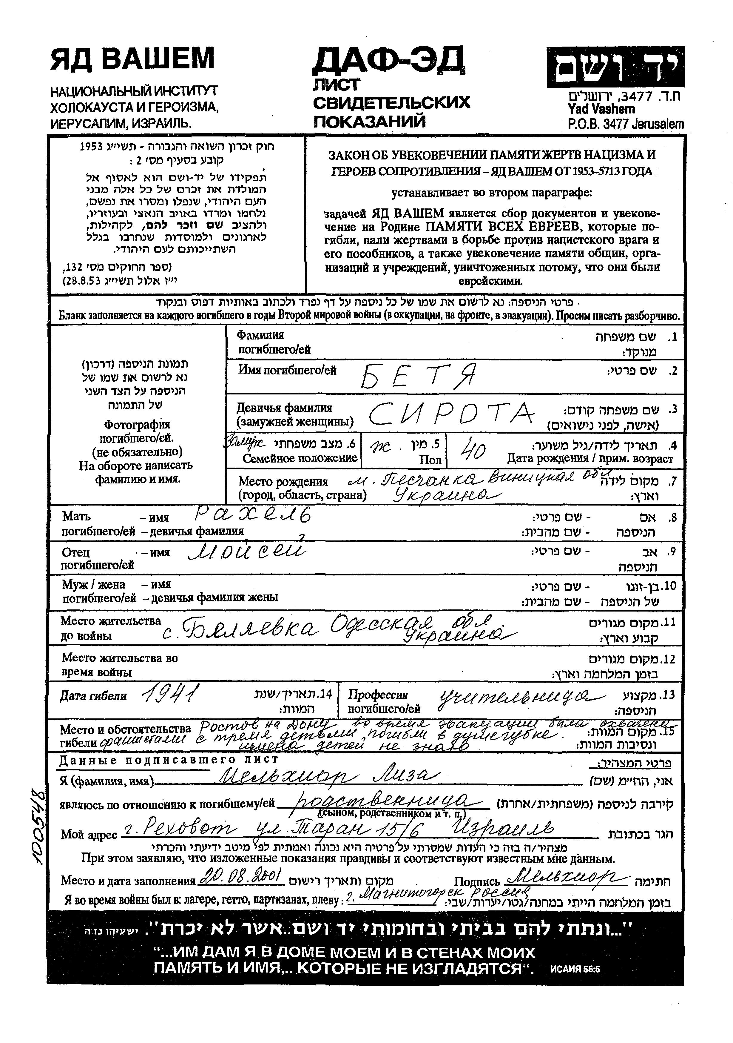 Betya Surname unknown nee Sirota was born in Peschanka, Ukraine (USSR) to Moisei and Rakhel. She was a teacher. Prior to WWII she lived in Belyayevka, Ukraine (USSR). Betya was murdered in the Shoah. Place of death: Rostov, Russia (USSR), 1941.
