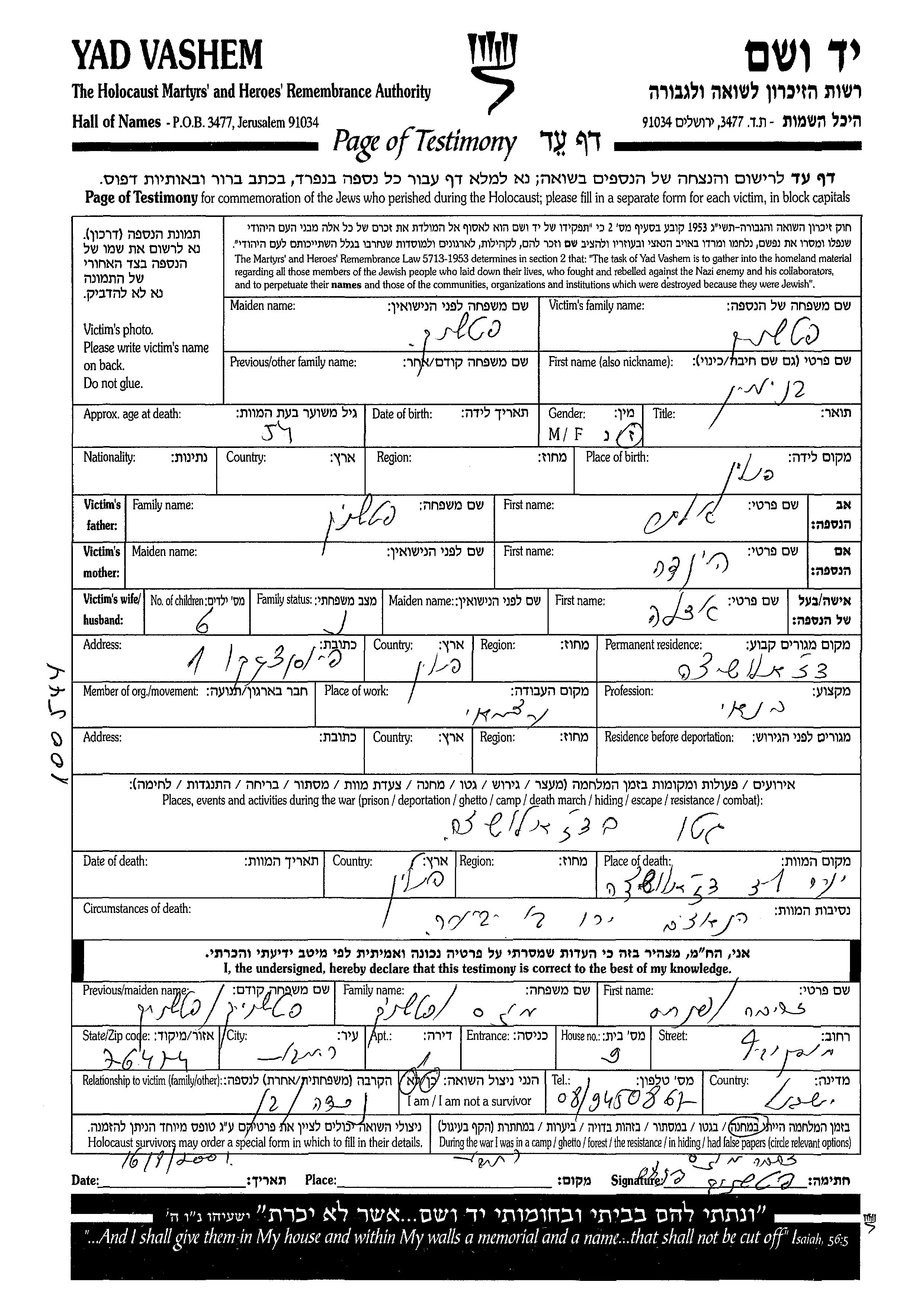Yad Vashem - Pages of Testimony Names Memorial Collection
