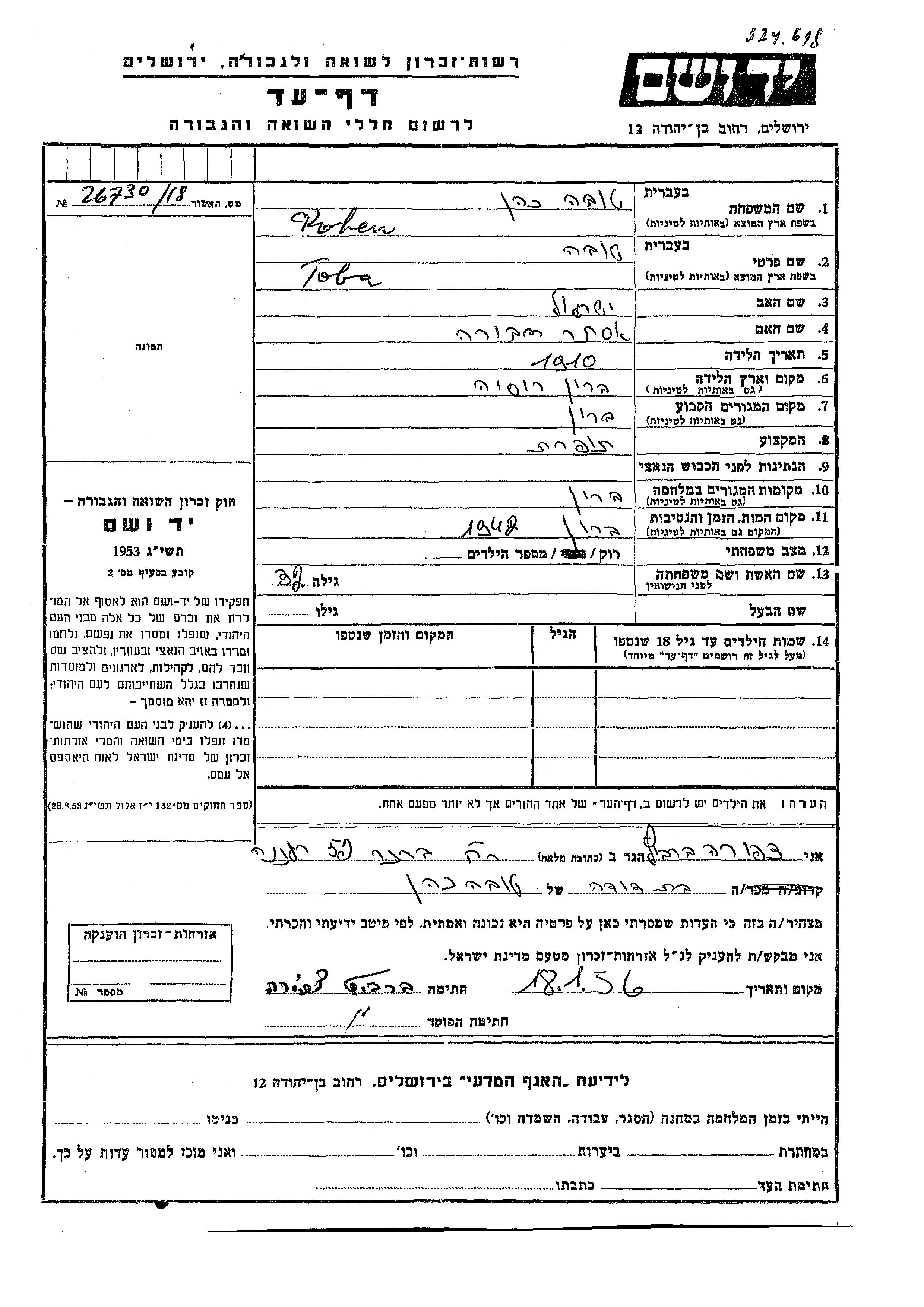 Toba Tova Kohen was born in Barow, Poland, 1910 to Yisrael and Ester Dvora. She was a seamstress and single. Prior to WWII she lived in Barow, Poland. During the war she was in Barow, Poland.