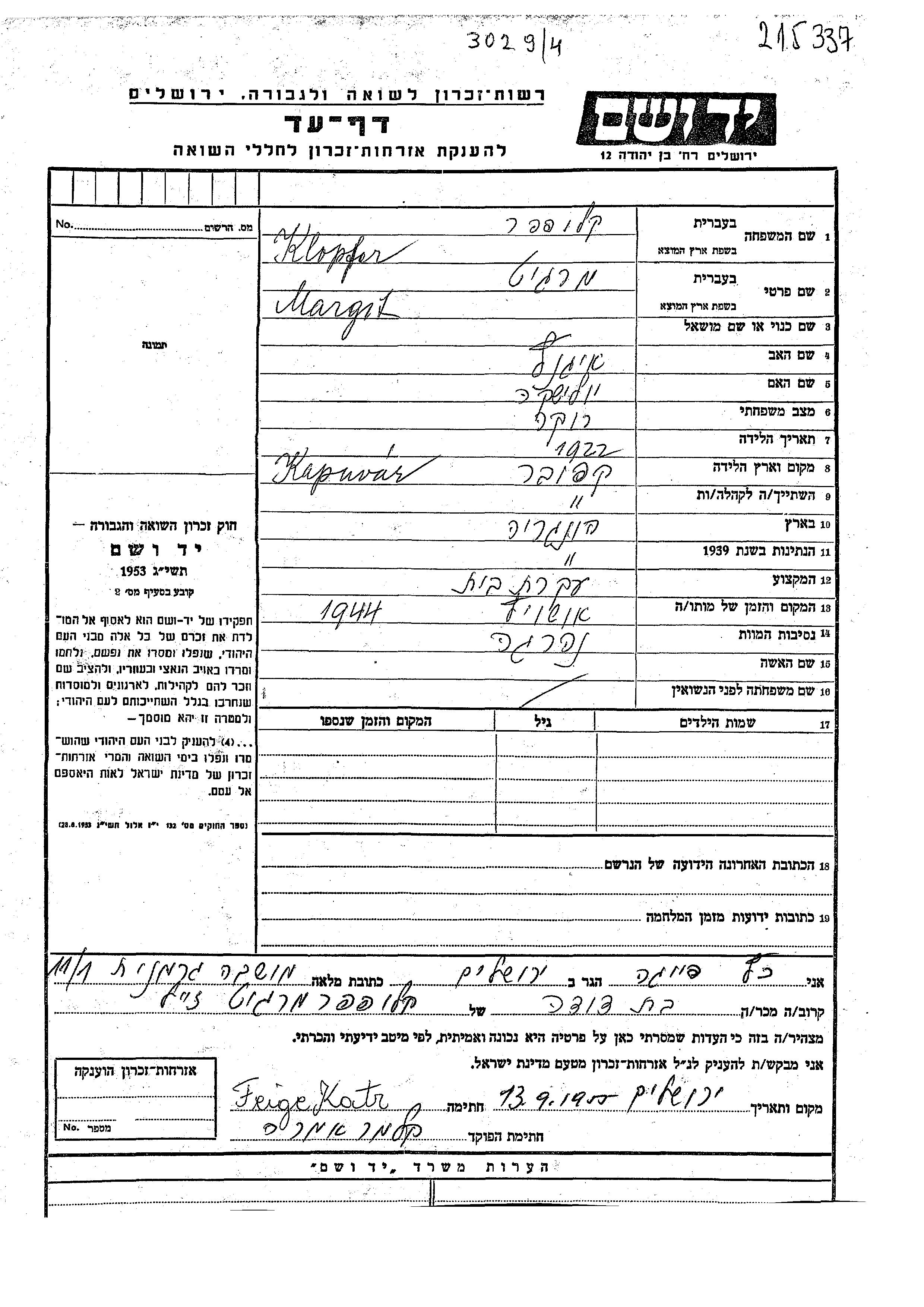 Klopfer Margit 1922 Kapuvar, Hungary Page of Testimony
