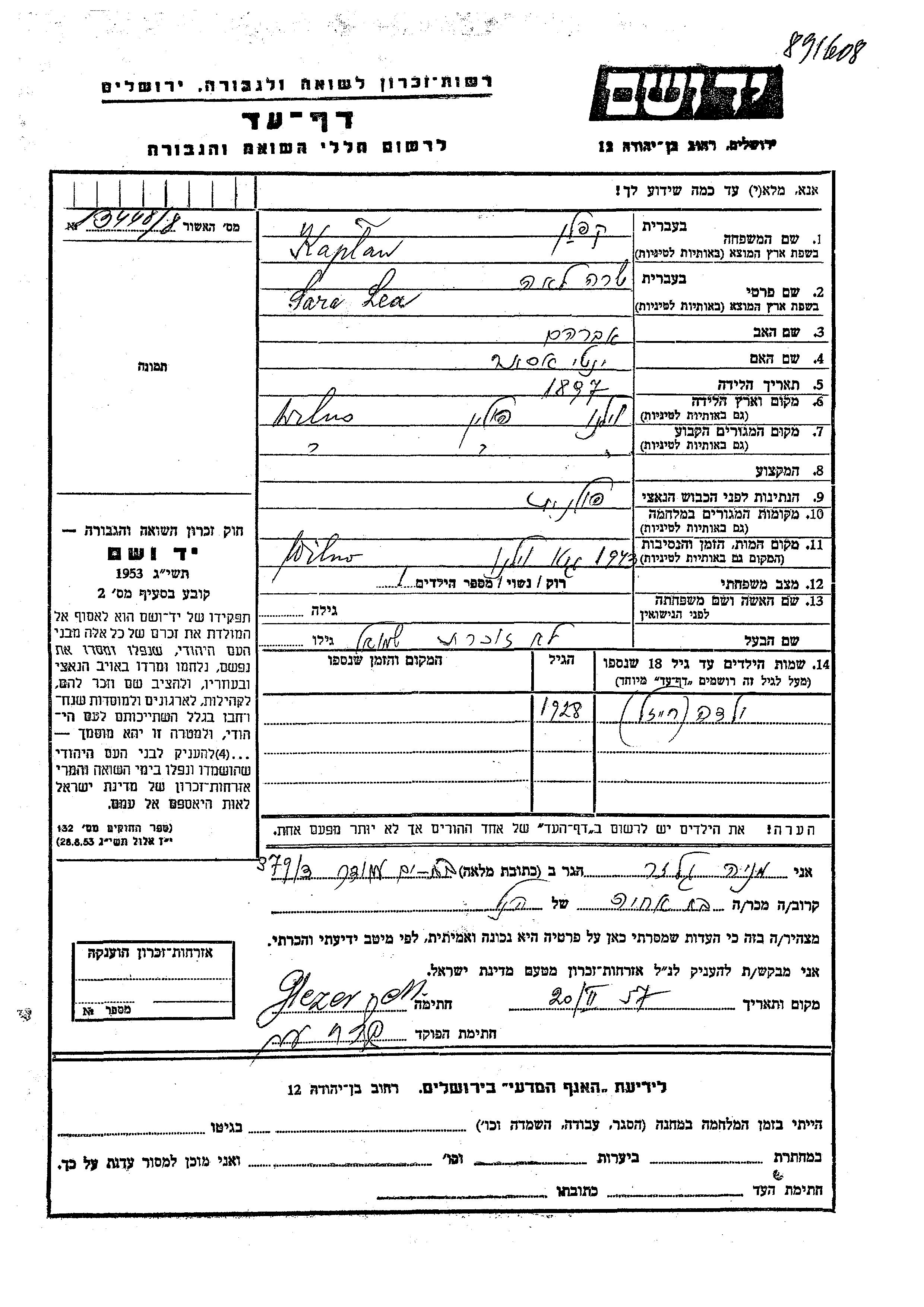 Sara Lea Kaplan was born in Wilno, Poland, 1897 to Avraham and Yenti Ester. She was married to Shmuel. Prior to WWII she lived in Wilno, Poland.