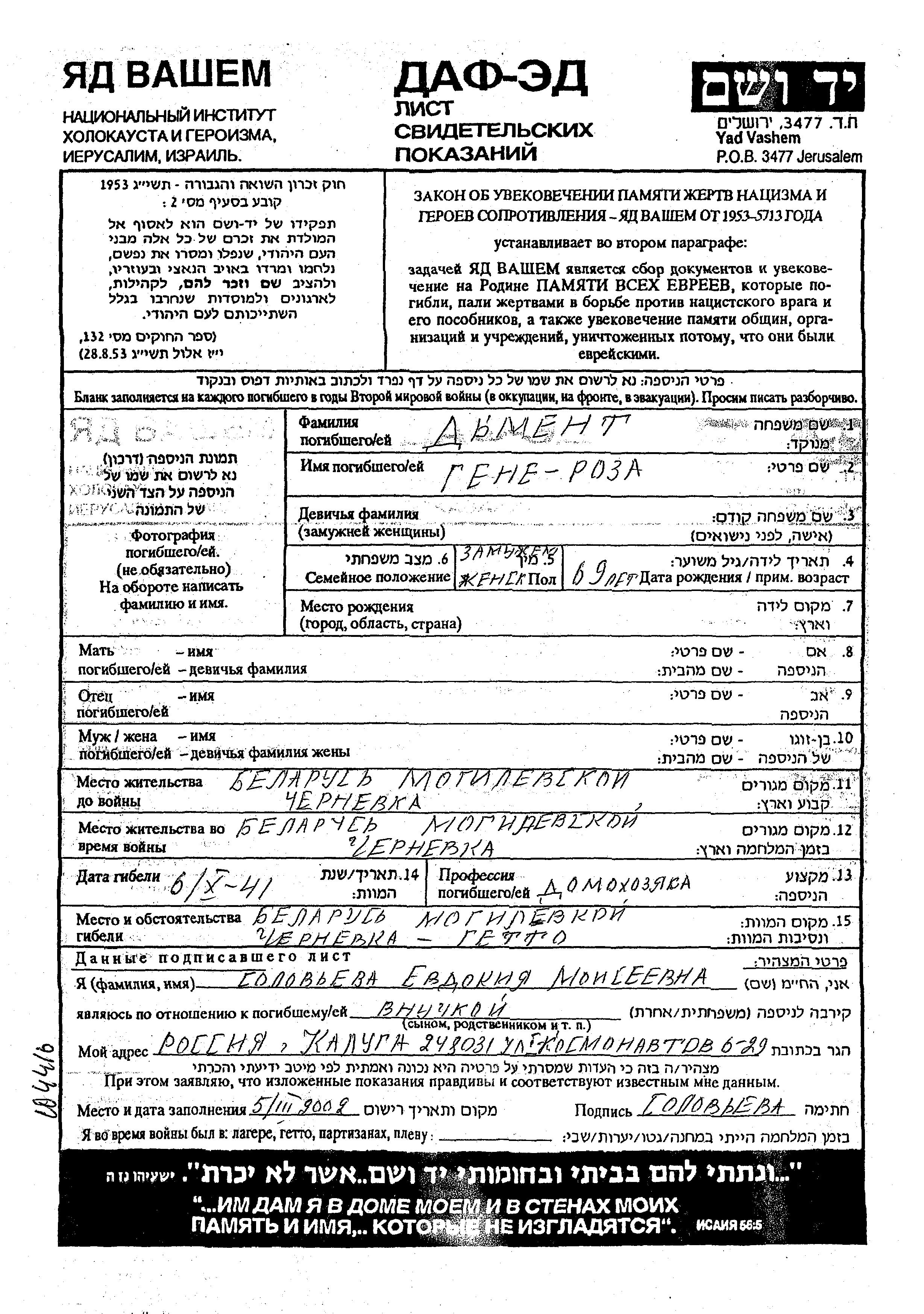 Gene Roza Dyment. She was a housewife and married. Prior to WWII she lived in Chernevka, Belorussia (USSR). During the war she was in Chernevka, Belorussia (USSR). Gene Roza was murdered in the Shoah. Place of death: Chernevka, Belorussia (USSR), 1941.