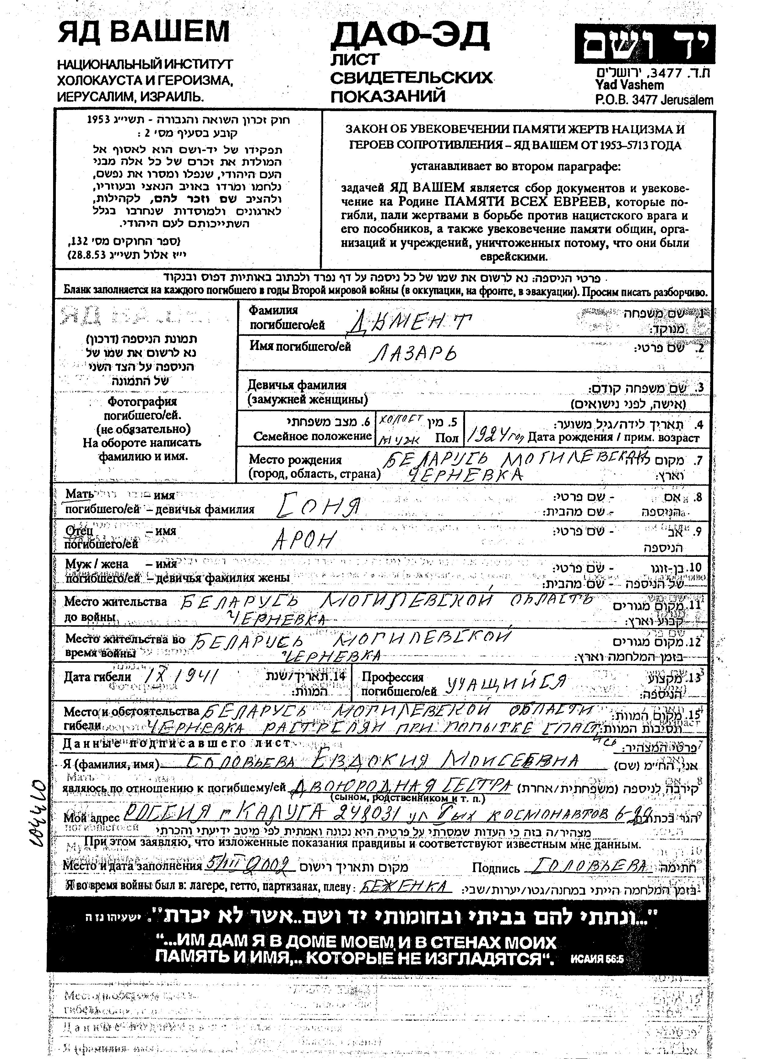 Lazar Dyment was born in Chernevka, Belorussia (USSR), 1924 to Aron and Sonya. He was a pupil and single. Prior to WWII he lived in Chernevka, Belorussia (USSR). During the war he was in Chernevka, Belorussia (USSR). Lazar was murdered in the Shoah. Place of death: Chernevka, Belorussia (USSR), 1941.