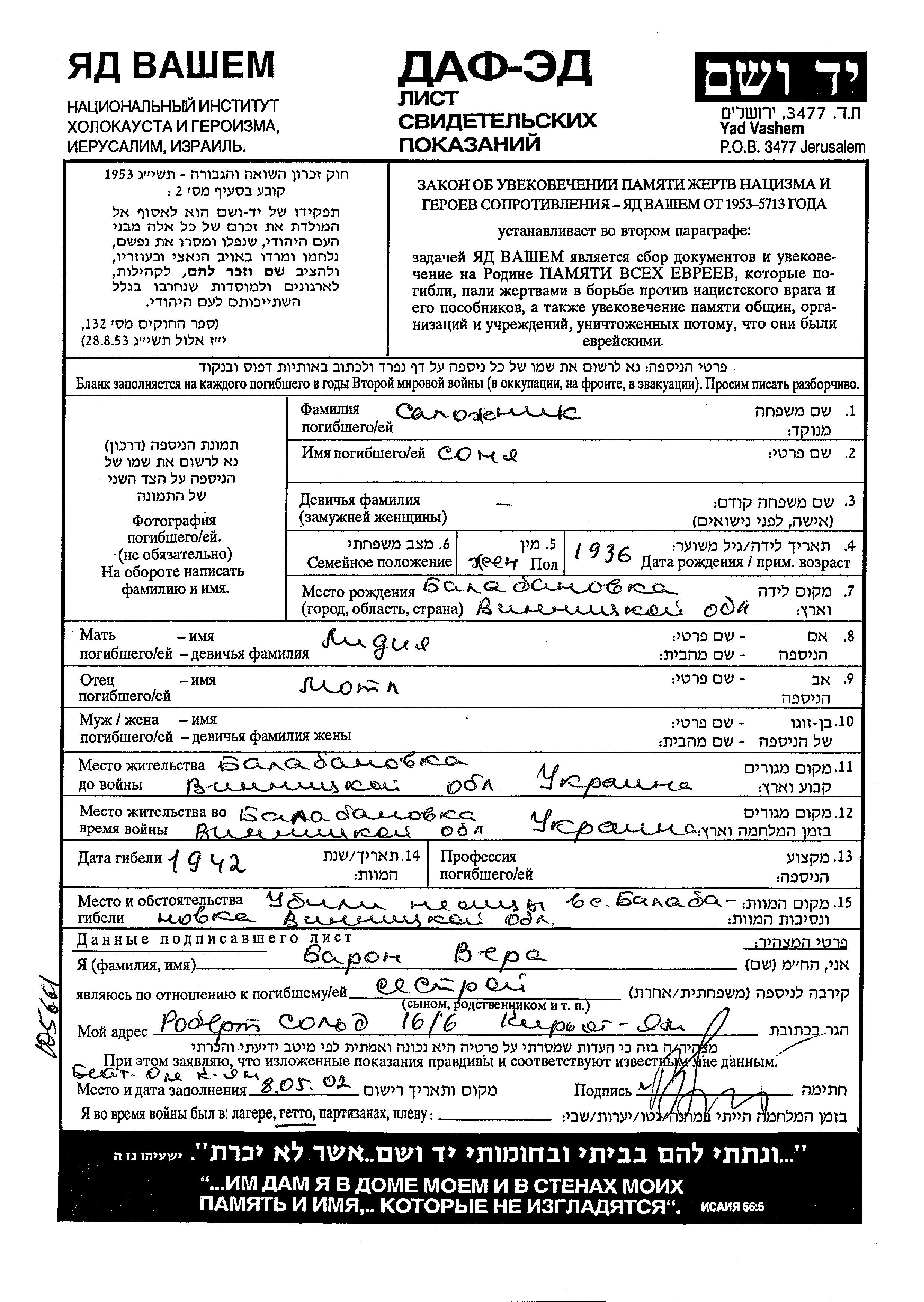 Sapozhnik Sonya 1936 Balabanovka, Ukraine (USSR) Page of Testimony