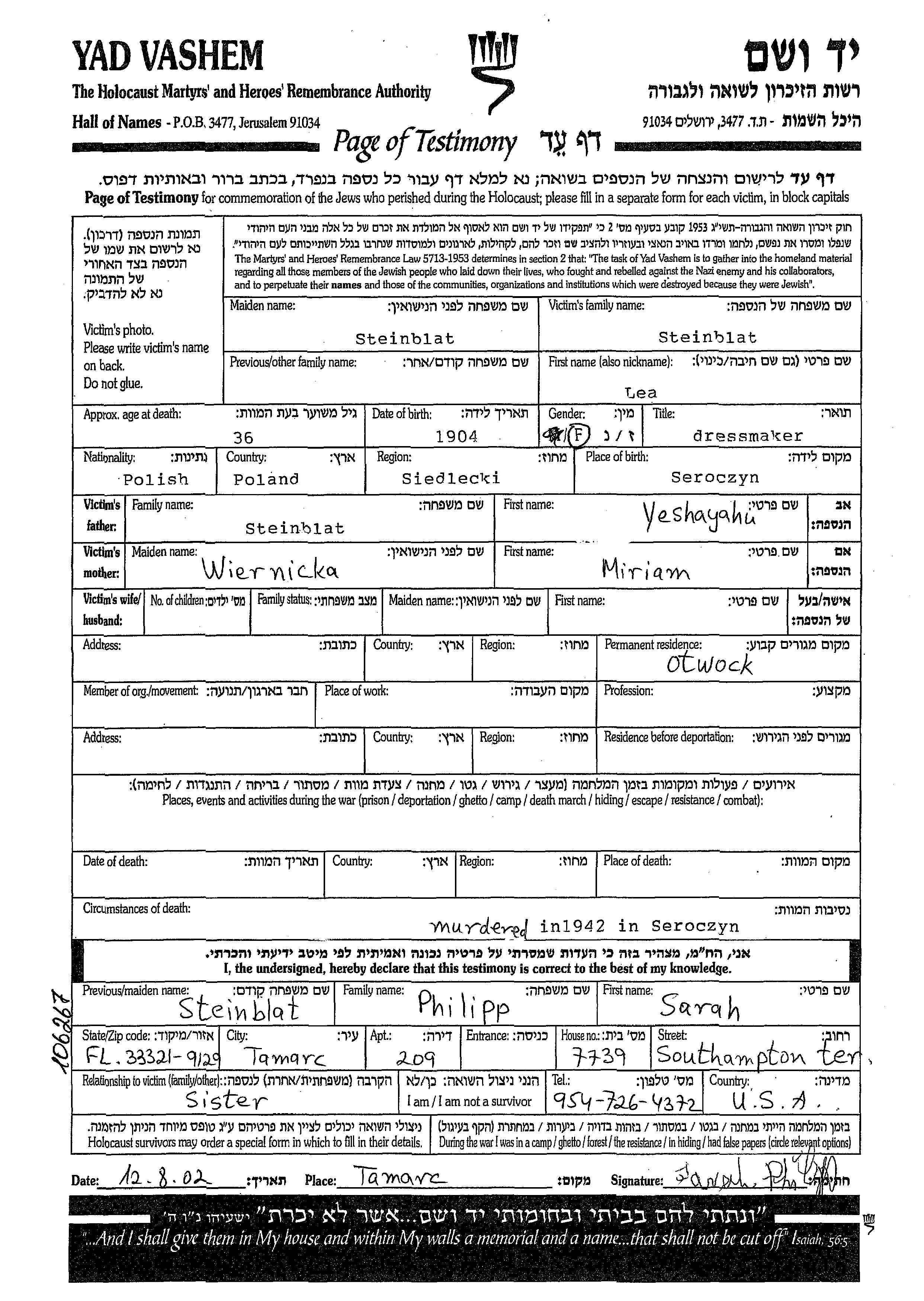 Lea Steinblat was born in Seroczyn, Poland, 1904 to Yashayahu and Miriam. Prior to WWII she lived in Otwock, Poland. Lea was murdered in the Shoah. Place of death: Seroczyn, Poland, 1942.