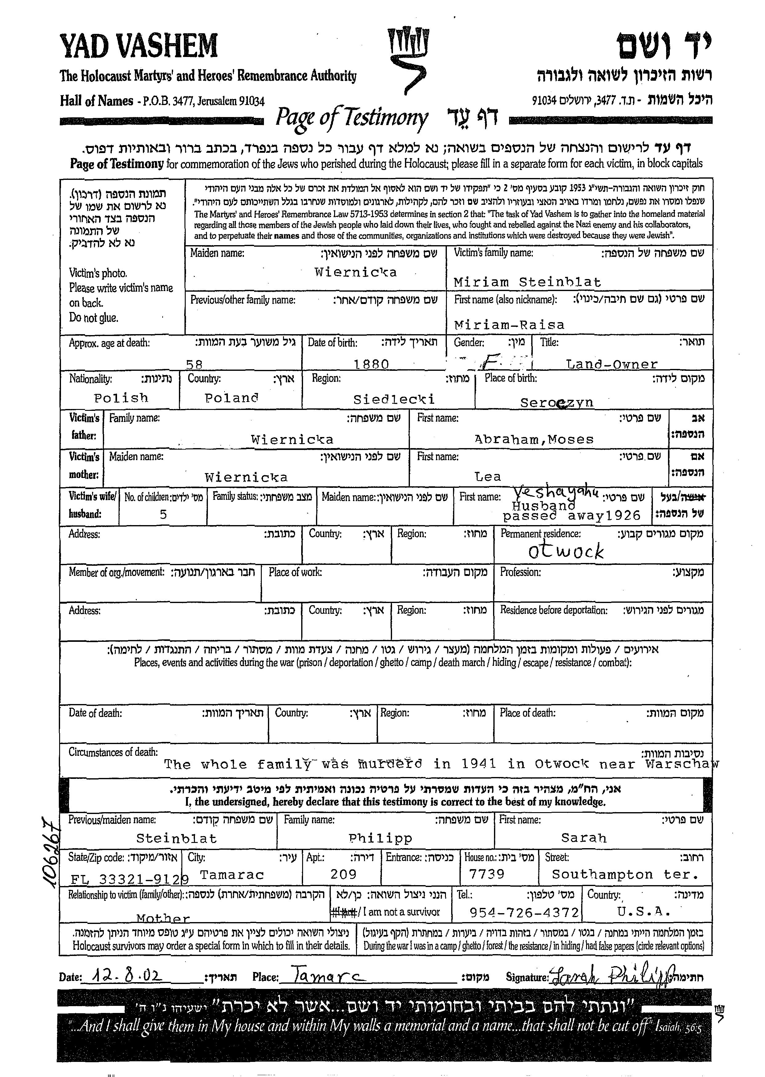 Miriam Raisa Steinblat nee Wiernicka was born in Seroczyn, Poland, 1880 to Abraham Moses and Lea. She was a landowner and a widow of Yeshayahu. Prior to WWII she lived in Otwock, Poland. Miriam Raisa was murdered in the Shoah. Place of death: Otwock, Poland, 1941.
