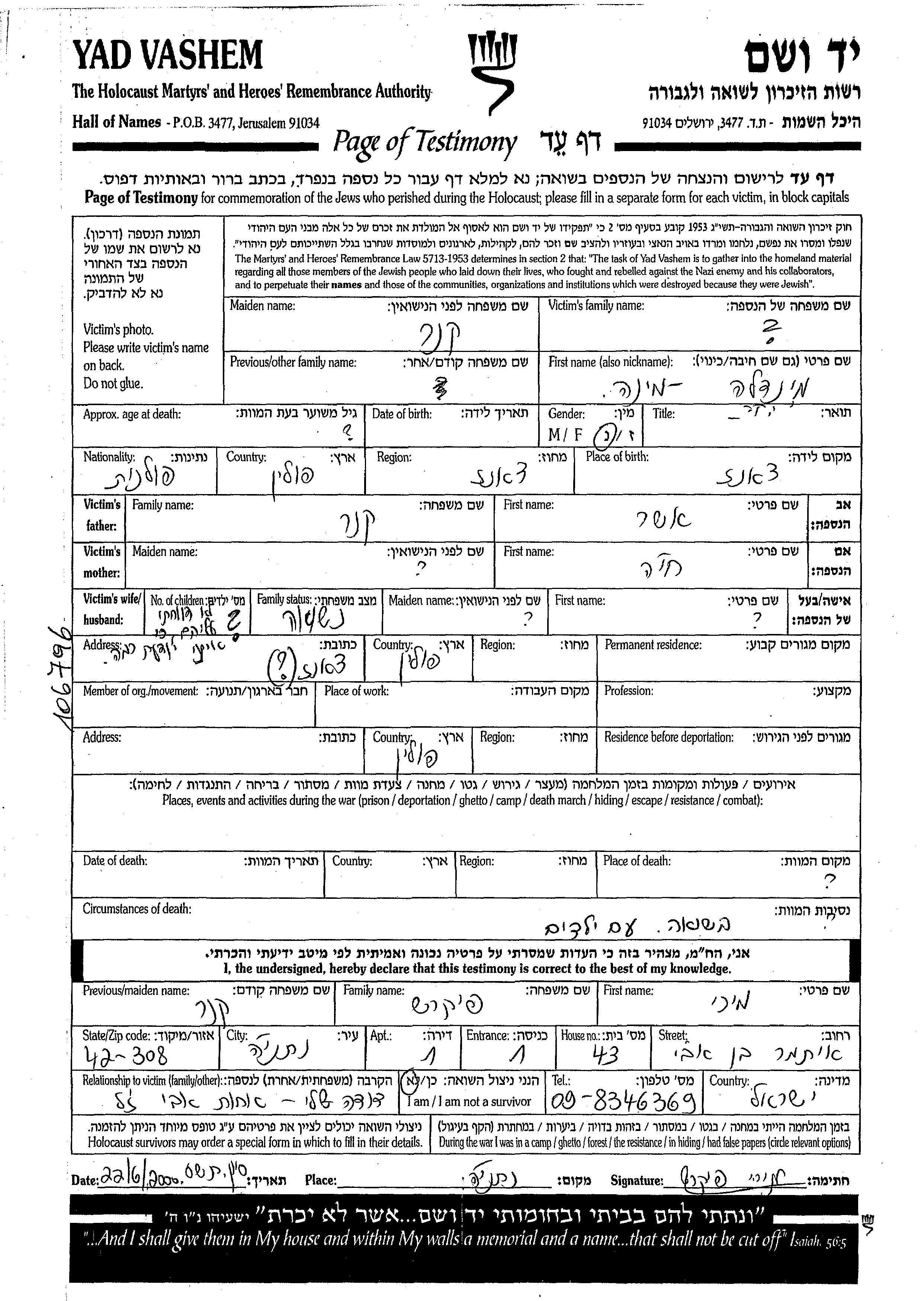 Yad Vashem - Pages of Testimony Names Memorial Collection