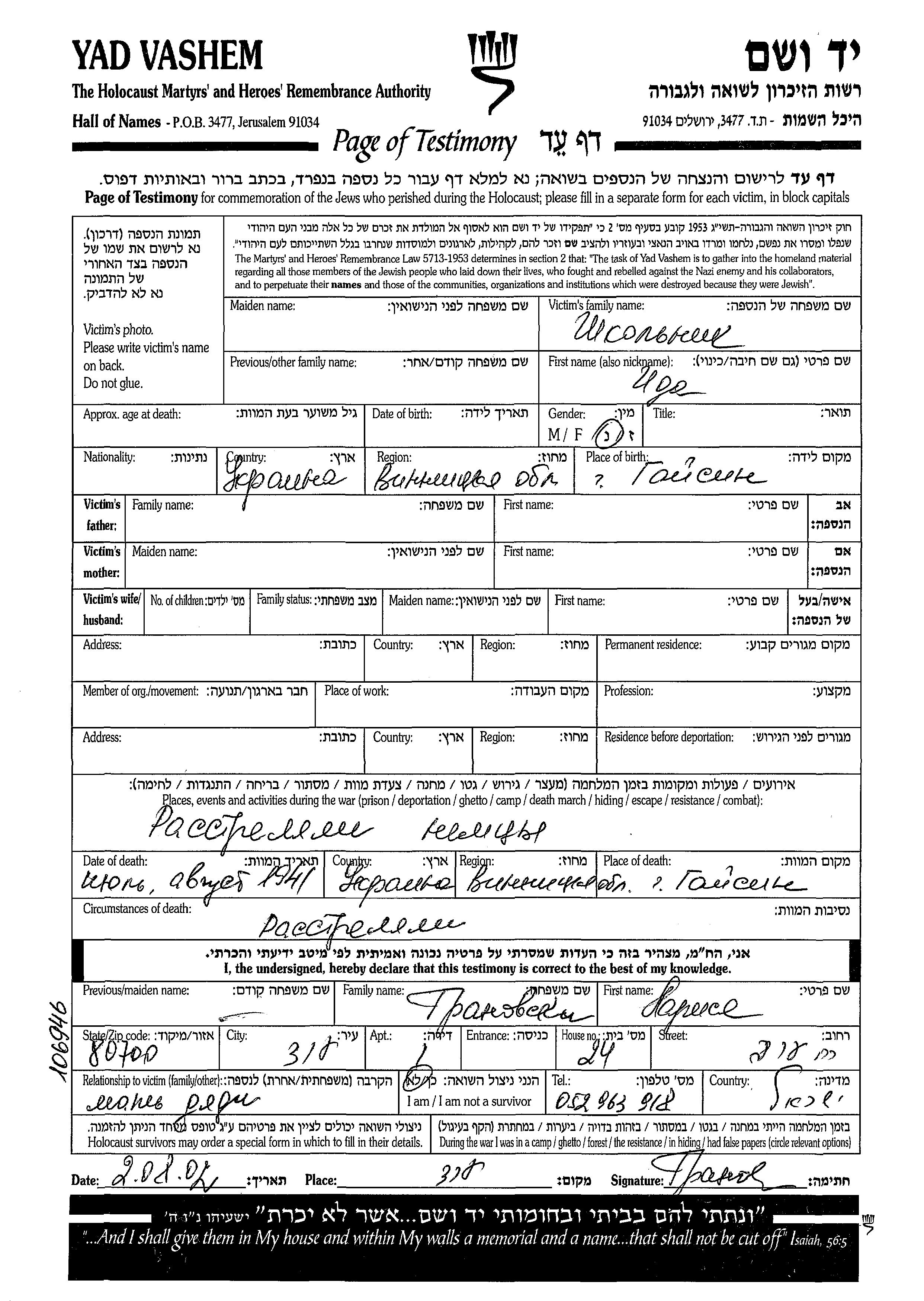 Shkolnik Ida Gaisin, Ukraine (USSR) Page of Testimony