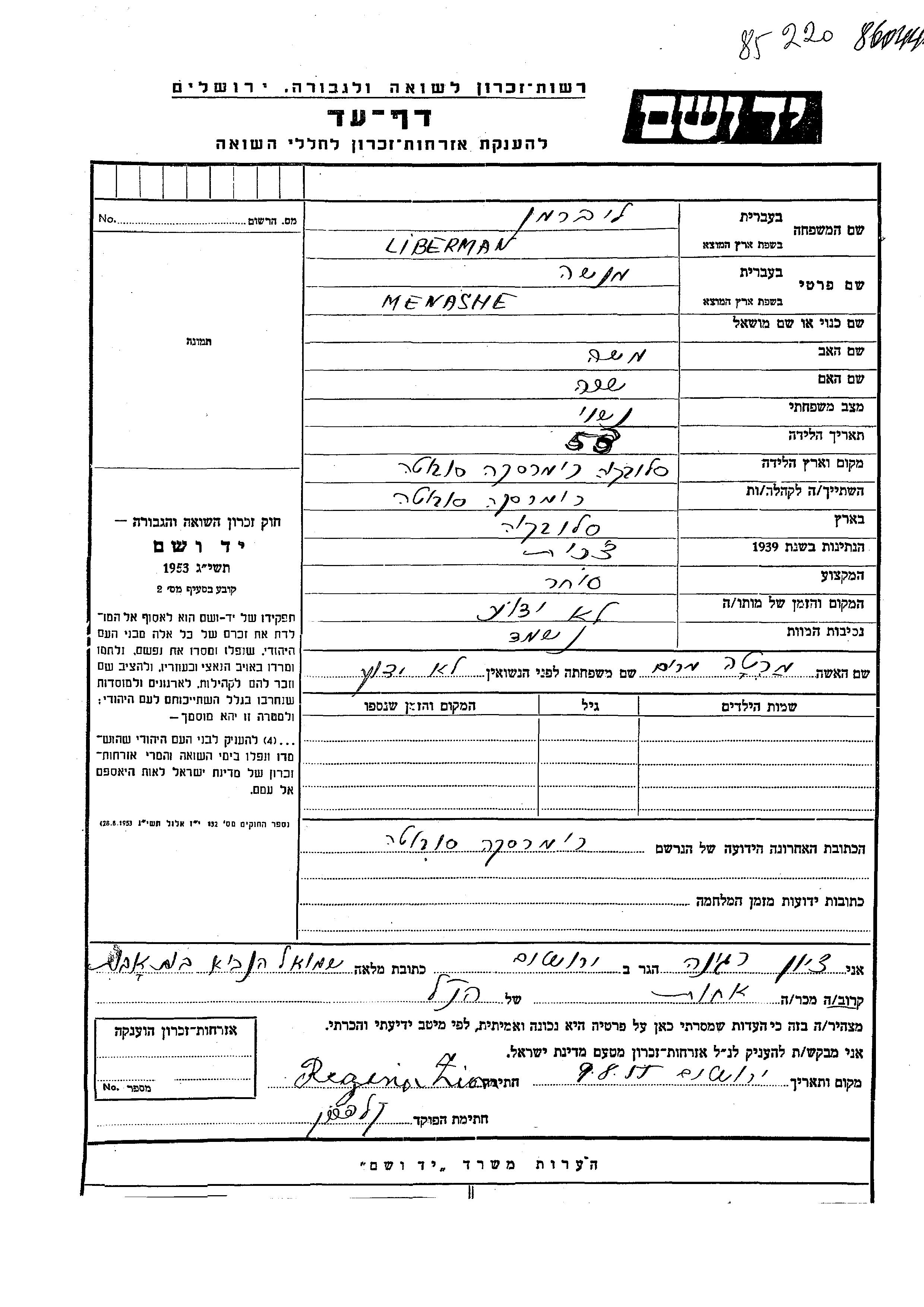 Liberman Menashe unstated place, Page of Testimony
