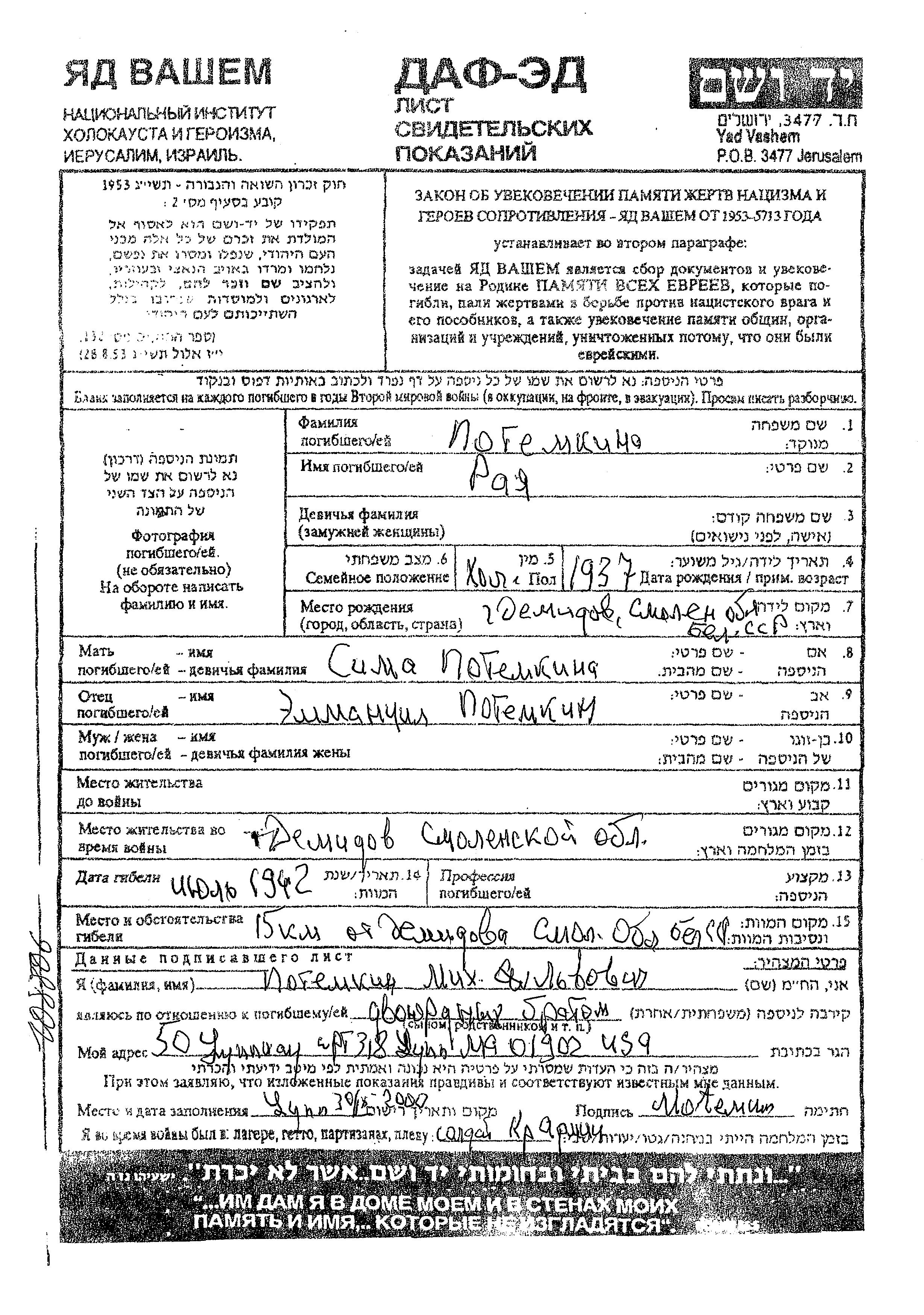 Raya Potemkina was born in Demidov, Russia (USSR), 1937 to Emmanuil and Sima. She was child. Prior to WWII she lived in Demidov, Russia (USSR). During the war she was in Demidov, Russia (USSR). Raya was murdered in the Shoah. Place of death: Demidov, Russia (USSR), 1942.