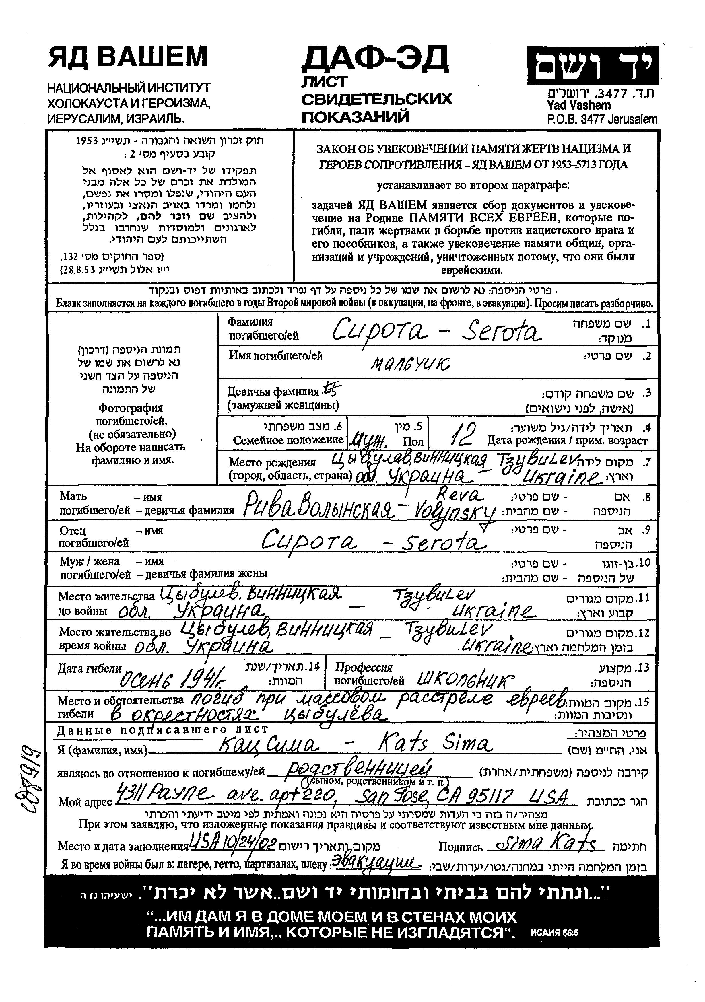 First name unknown Sirota was born in Tsibulev, Ukraine (USSR) to Riva. He was a pupil and child. Prior to WWII he lived in Tsibulev, Ukraine (USSR). During the war he was in Tsibulev, Ukraine (USSR). He was murdered in the Shoah. Place of death: Tsibulev, Ukraine (USSR), 1941.