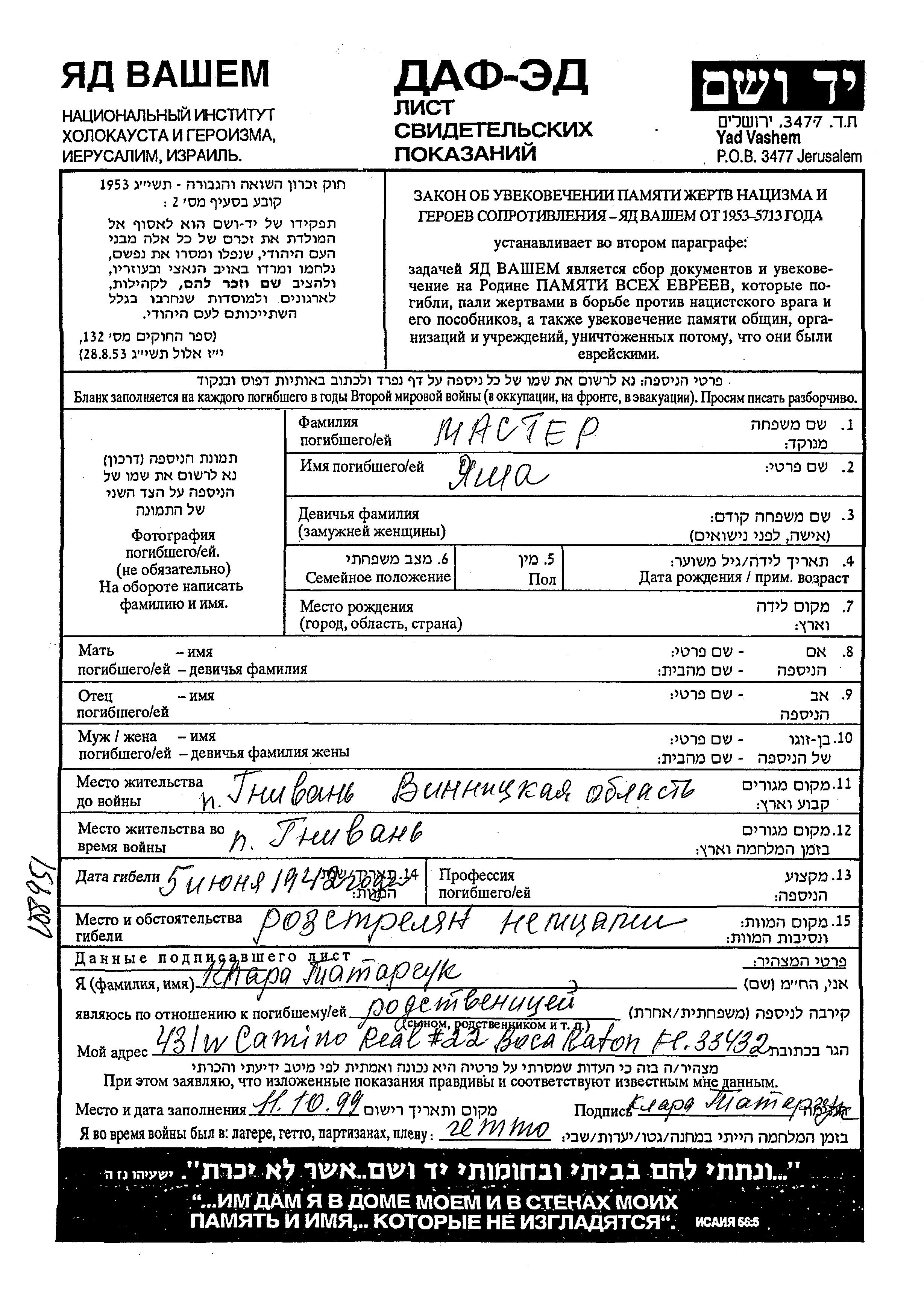Master Yasha Gnivan, Ukraine (USSR) Page of Testimony