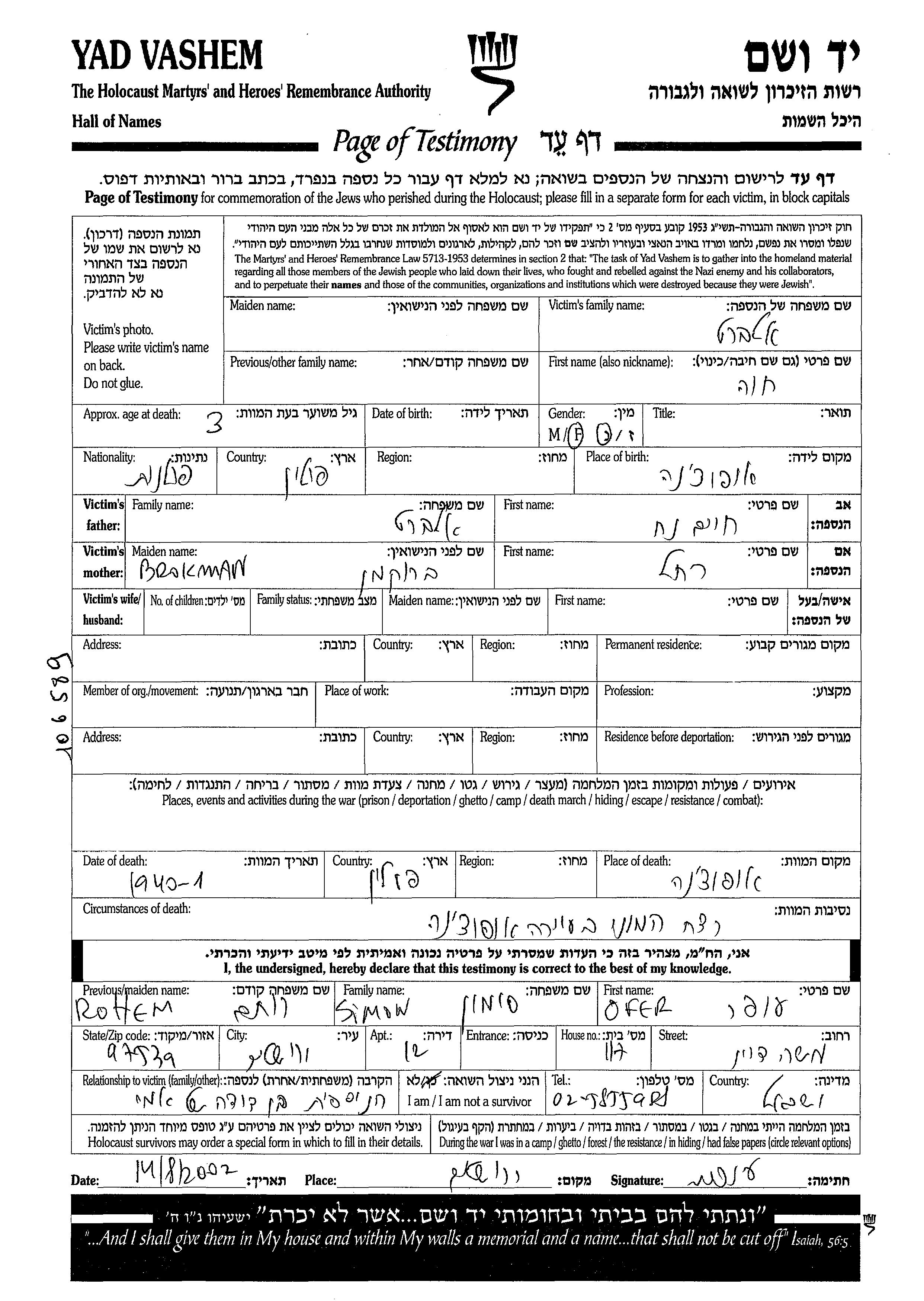 Yad Vashem - Pages of Testimony Names Memorial Collection