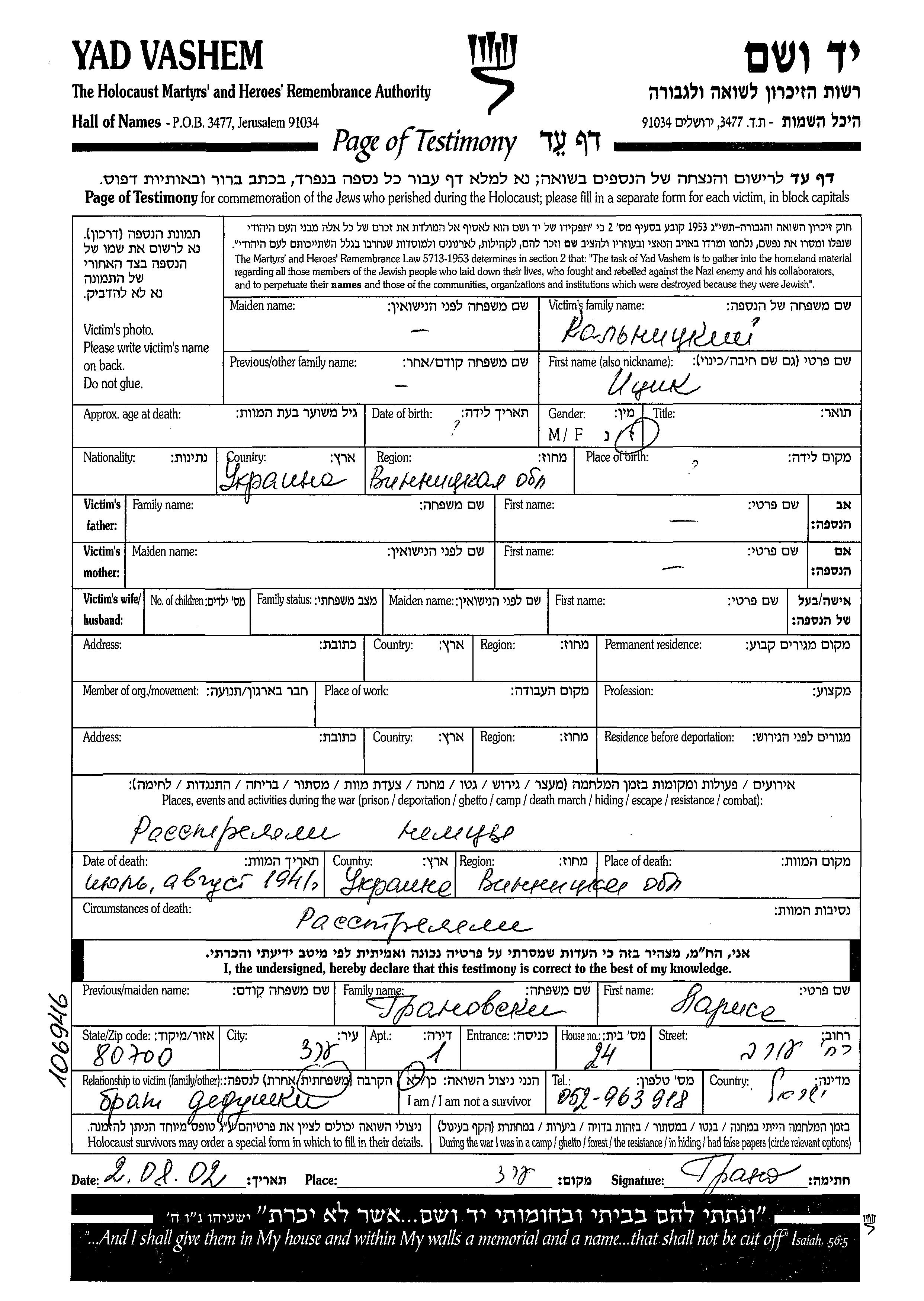 Yad Vashem - Pages of Testimony Names Memorial Collection