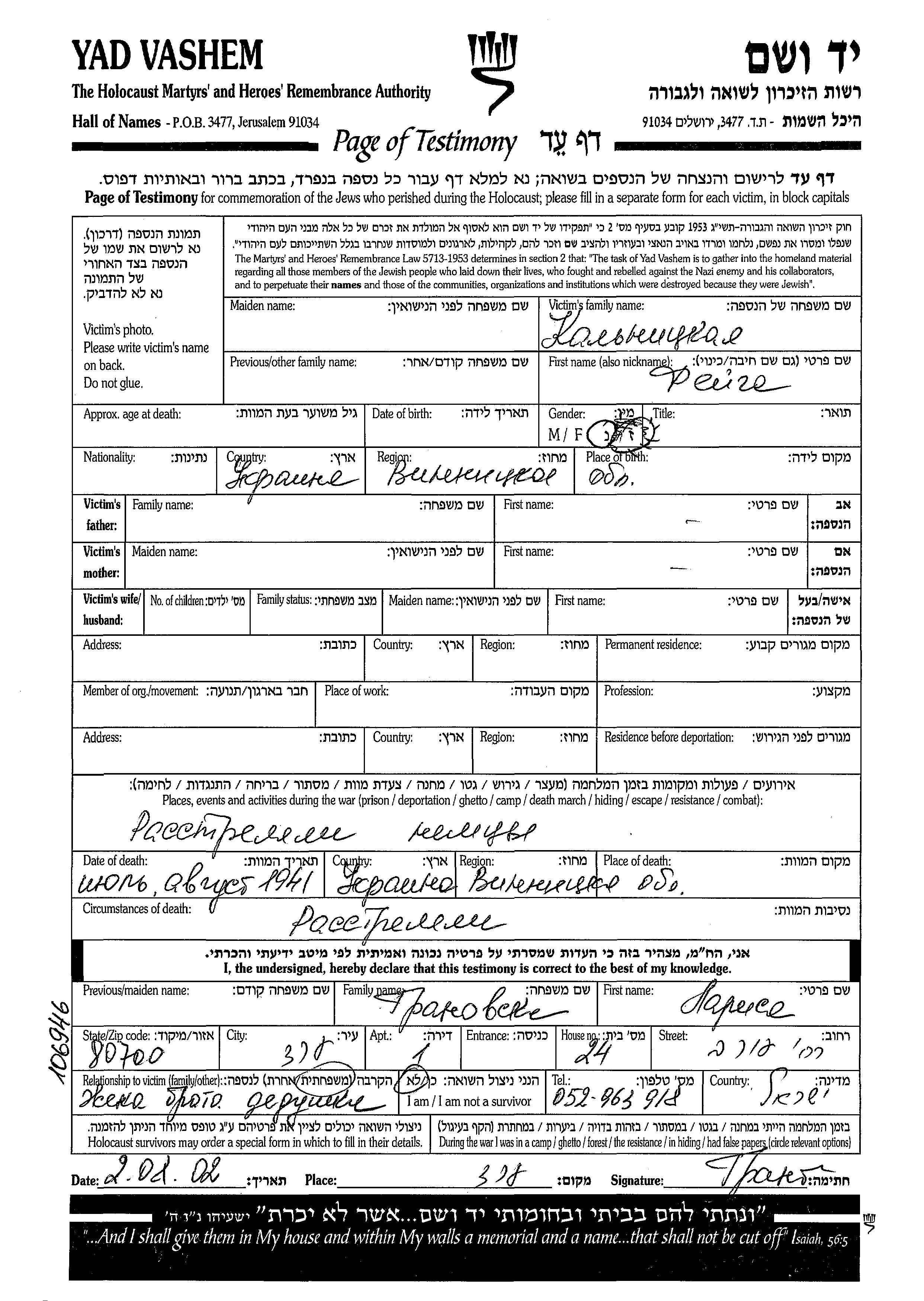 Kalnitzkaya Feiga Vinnitsa, Ukraine (USSR) Page of Testimony