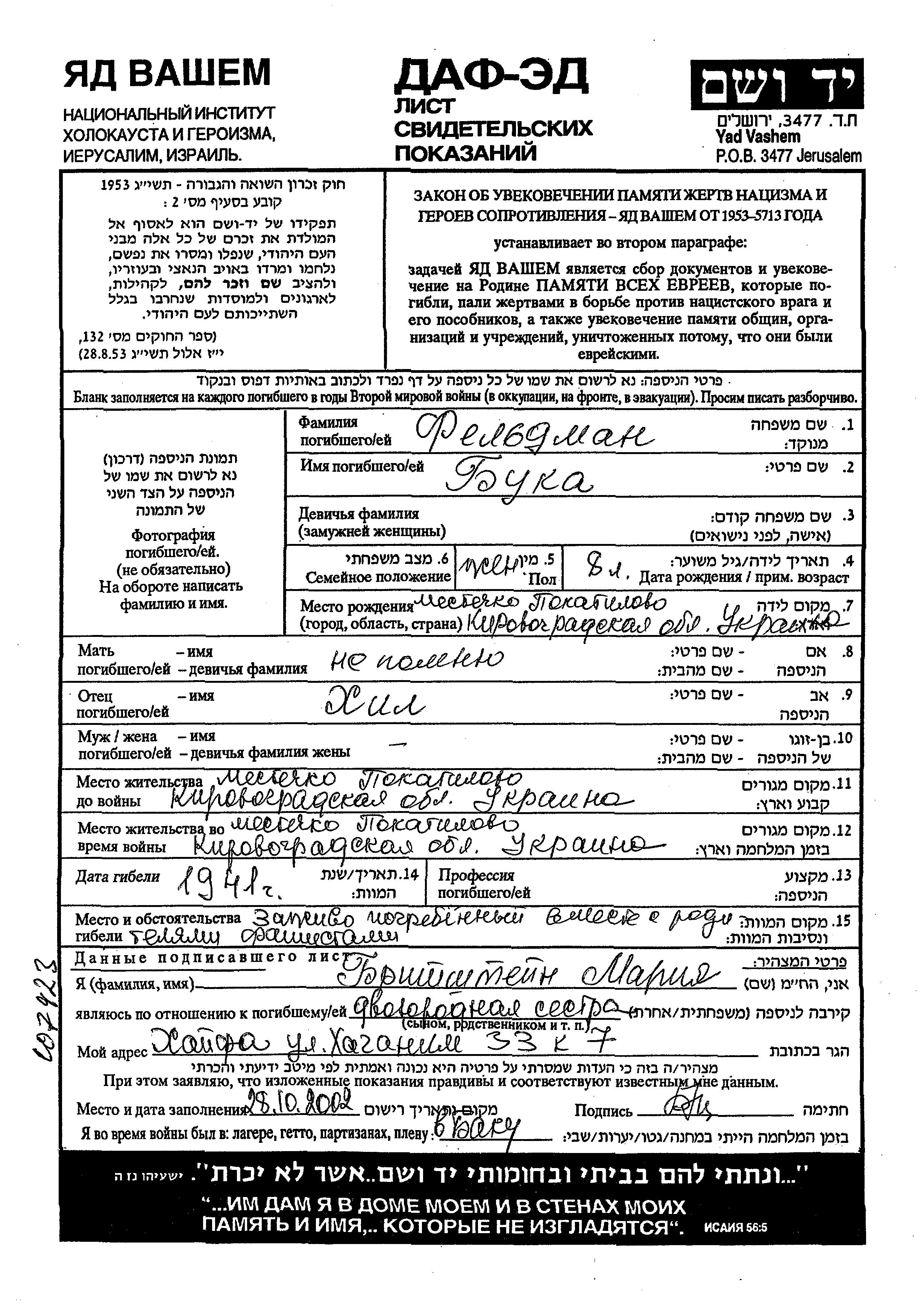Buka Feldman was born in Pokotilovo, Ukraine (USSR) to Khil. She was child. Prior to WWII she lived in Pokotilovo, Ukraine (USSR). During the war she was in Pokotilovo, Ukraine (USSR). Buka was murdered in the Shoah. Place of death: Pokotilovo, Ukraine (USSR), 1941.