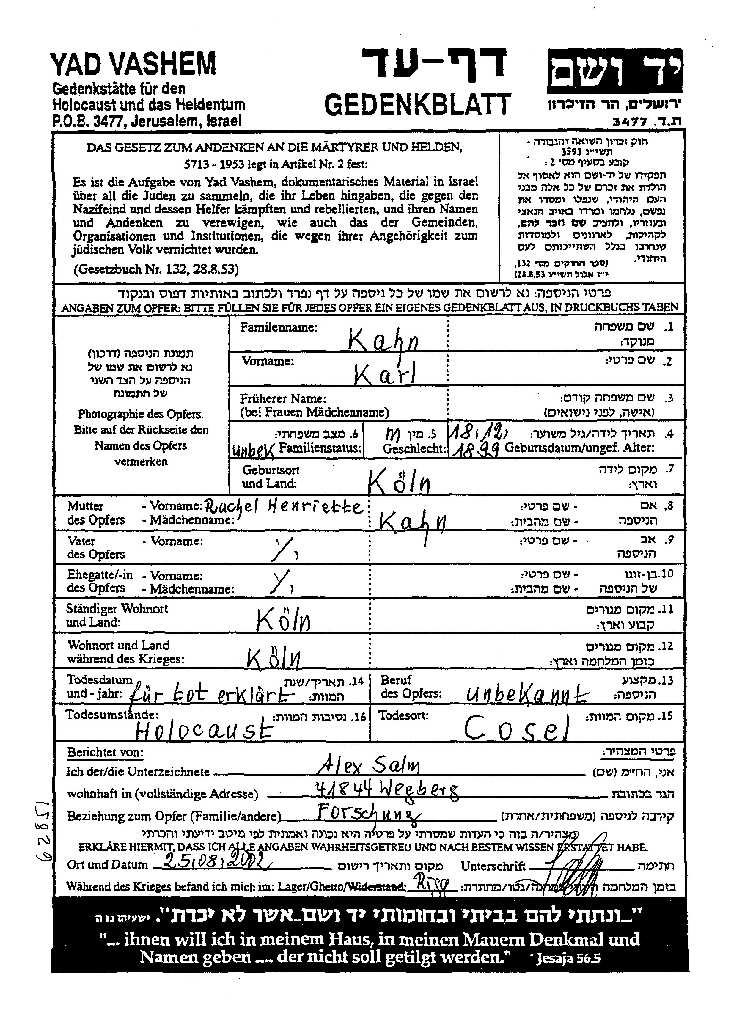 Karl Kahn was born in Koeln, Germany, 1899 to Rachel Henriette. Prior to WWII he lived in Koeln, Germany. During the war he was in Koeln, Germany. Karl was murdered in the Shoah. Place of death: Cosel, Germany.