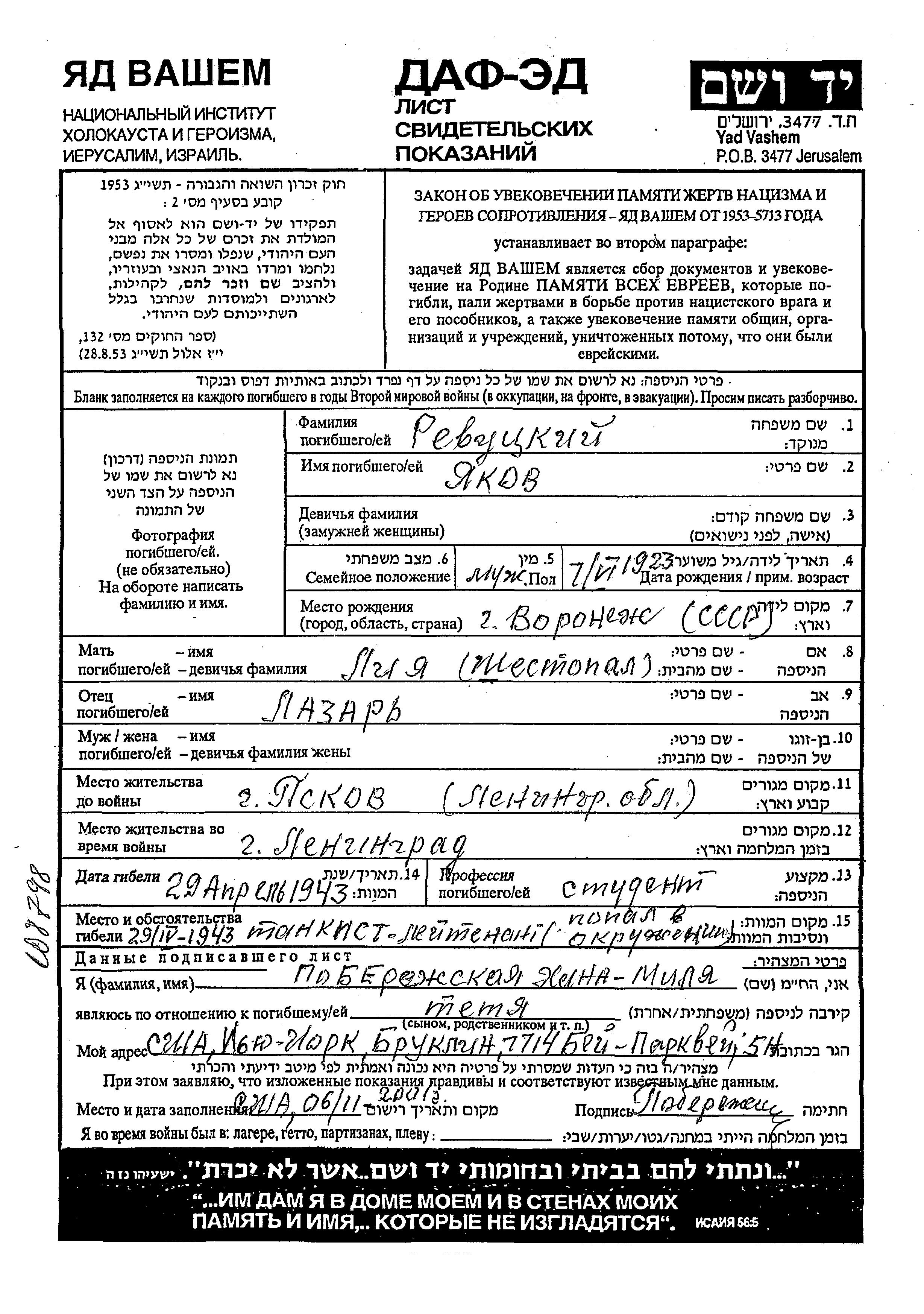 Yakov Revutzki was born in Voronezh, Russia (USSR), 1923 to Lazar and Liya. He was a student and single. Prior to WWII he lived in Pskov, Russia (USSR). During the war he was in the Soviet armed forces. Yakov was killed in military service in WWII. Place of death: unknown, 1943.