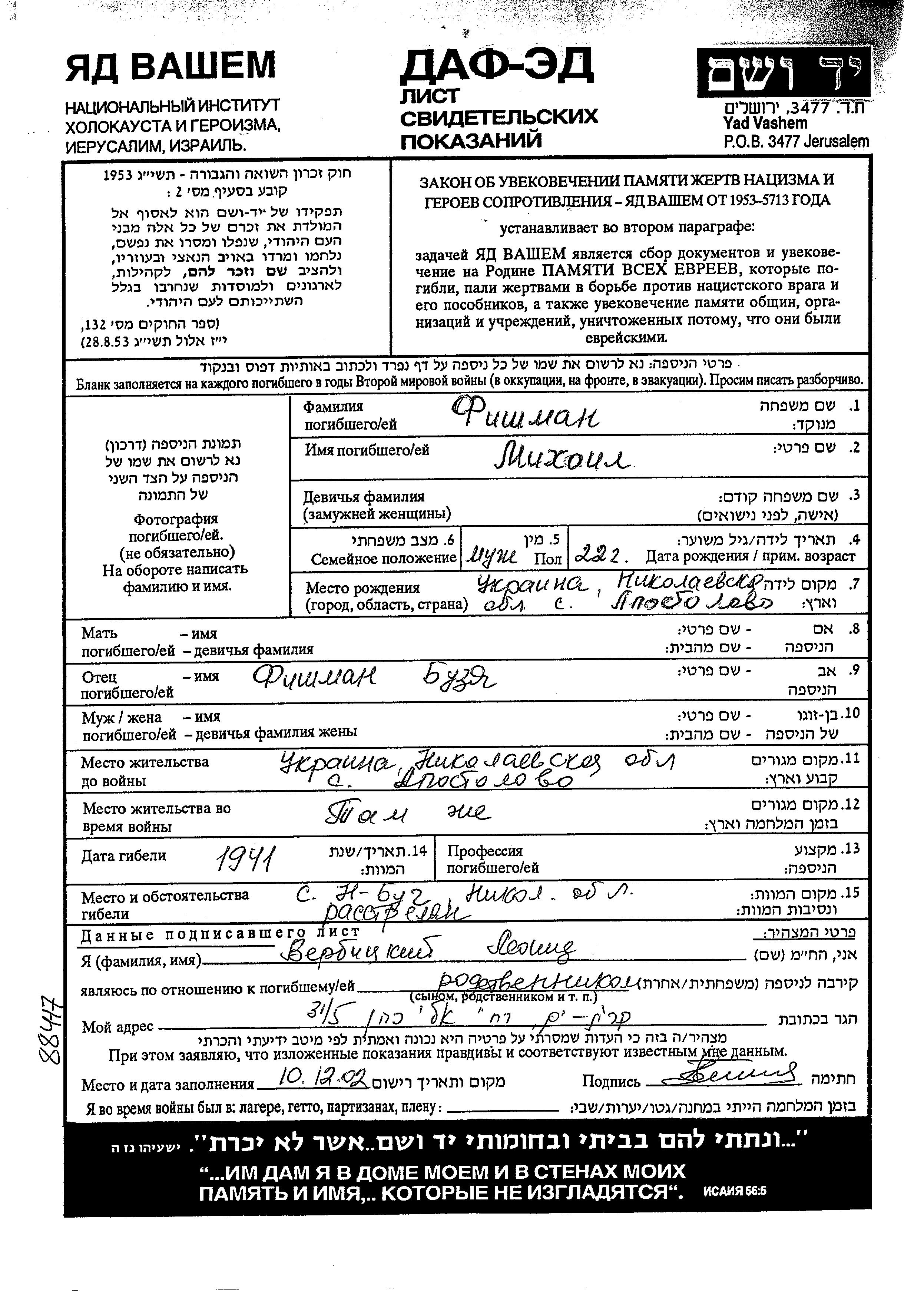 Mikhail Fishman was born in Apostolovo, Ukraine (USSR) to Buzya. He was single. Prior to WWII he lived in Apostolovo, Ukraine (USSR). During the war he was in Apostolovo, Ukraine (USSR). Mikhail was murdered in the Shoah. Place of death: Novy Bug, Ukraine (USSR), 1941.