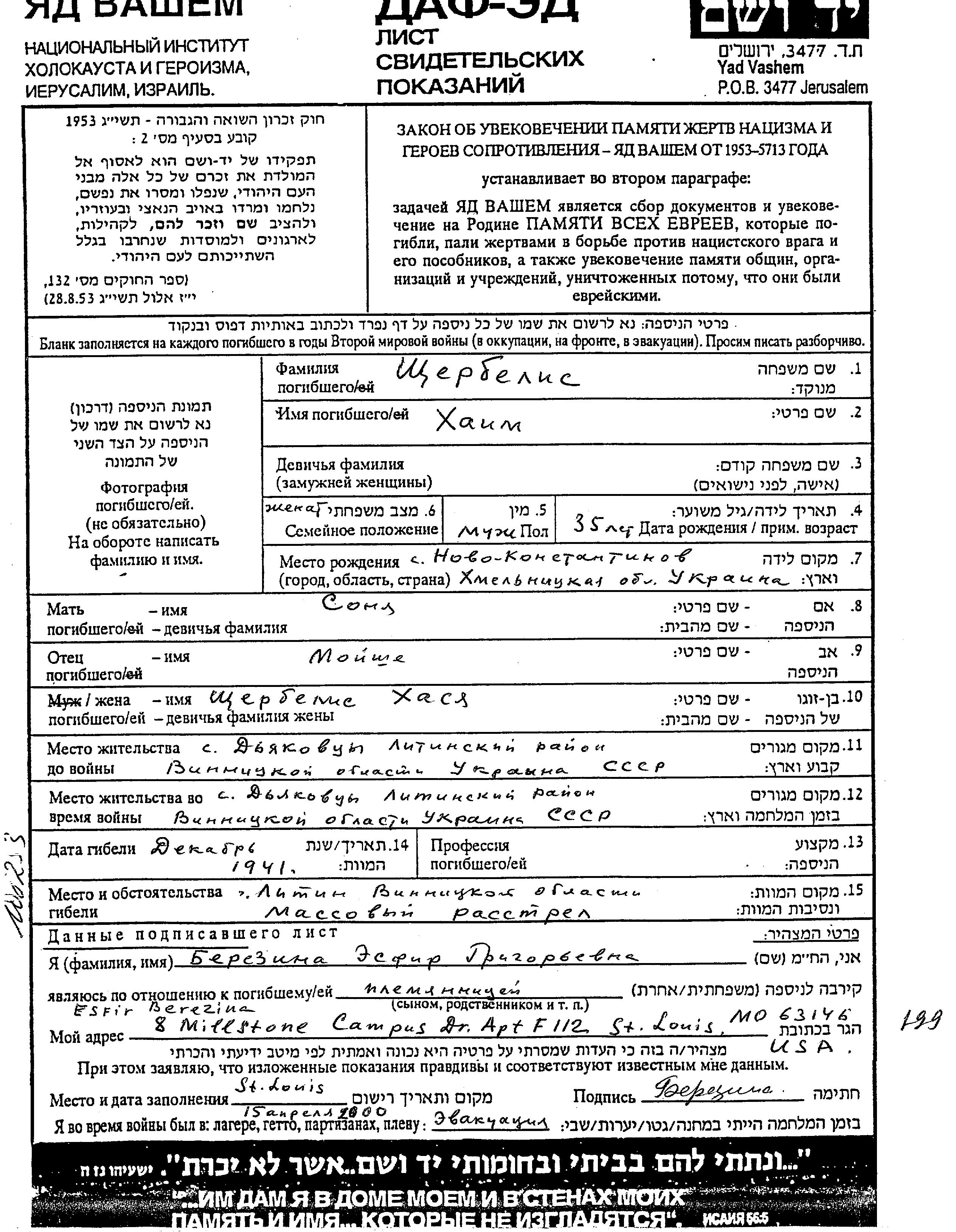 Khaim Shcherbelis was born in Novokonstantinov, Ukraine (USSR) to Moisha and Sonya. He was married to Khasya. Prior to WWII he lived in Dyakovtsy, Ukraine (USSR). During the war he was in Dyakovtsy, Ukraine (USSR). Khaim was murdered in the Shoah. Place of death: Litin, Ukraine (USSR), 1941.