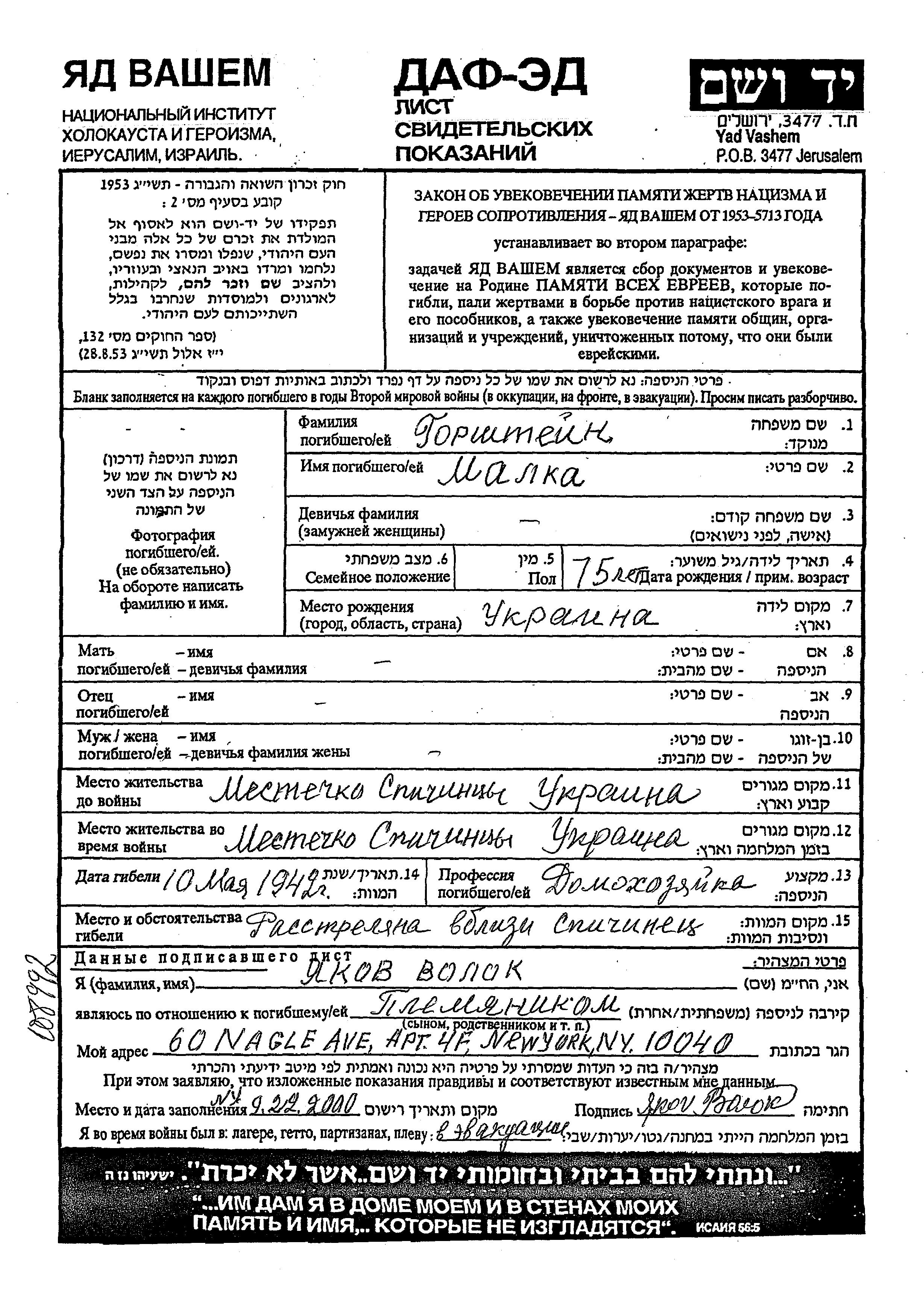 Malka Gorshtein was born in Ukraine (USSR). She was a housewife. Prior to WWII she lived in Spichintsy, Ukraine (USSR). During the war she was in Spichintsy, Ukraine (USSR). Malka was murdered in the Shoah. Place of death: Spichintsy, Ukraine (USSR), 1942.