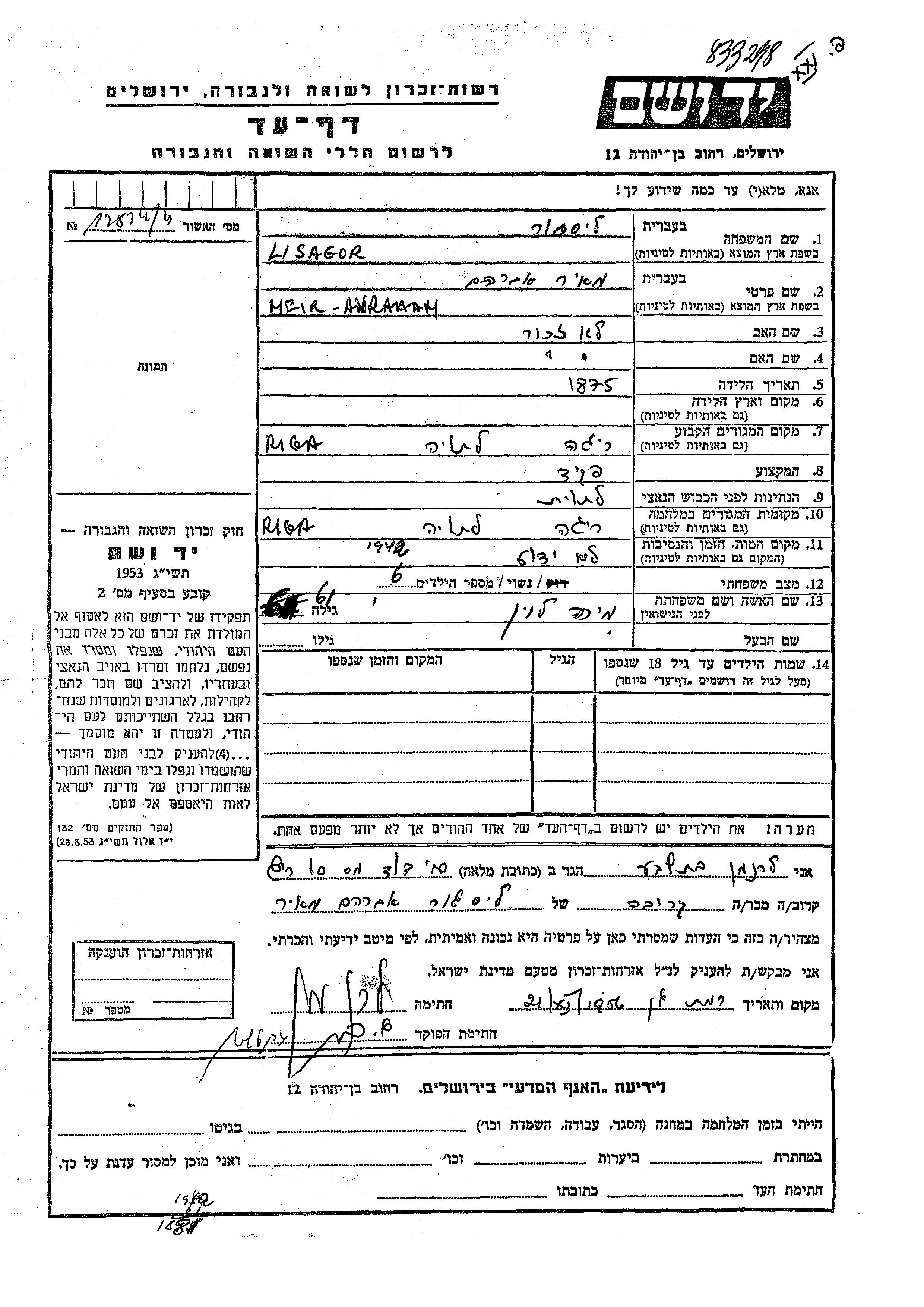 Awraham Meir Lisagor was born, 1875. He was a clerk and married to Mira nee Levin. Prior to WWII he lived in Riga, Latvia. During the war he was in Riga, Latvia. Awraham Meir was murdered in the Shoah. Place of death: unknown, 1942.