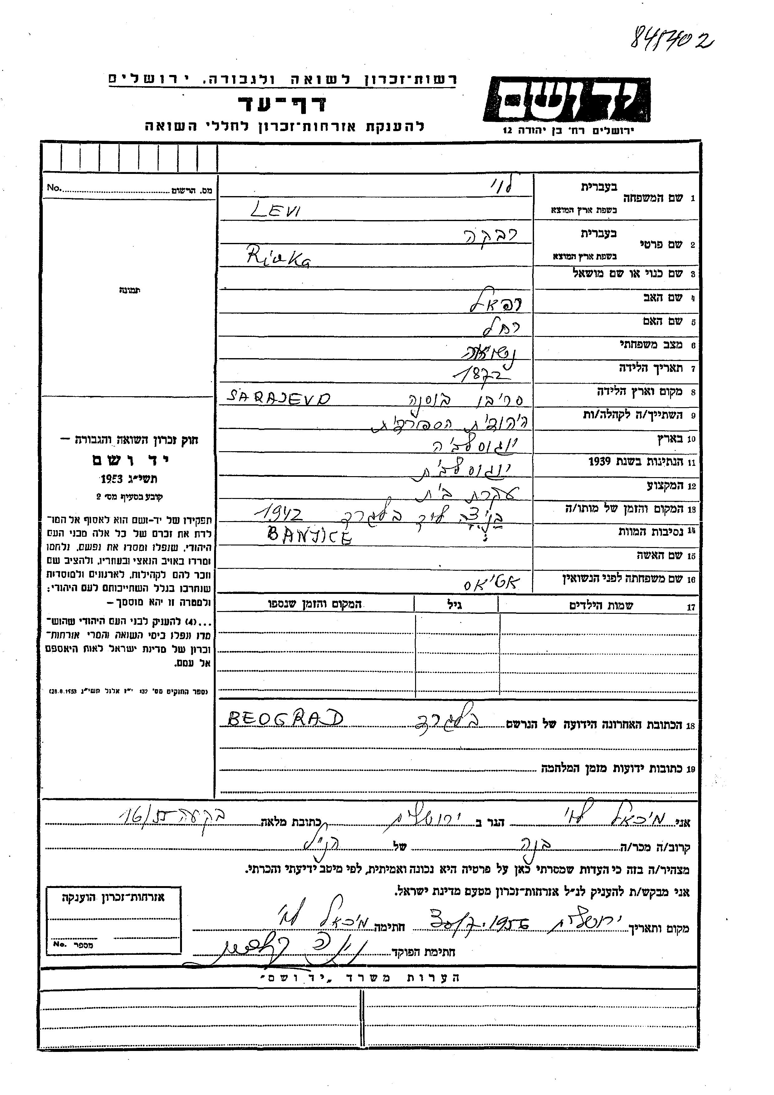 Rivka Levi nee Atias was born in Sarajevo, Yugoslavia, 1872 to Rafael and Rakhel. She was a housewife and married. Prior to WWII she lived in Yugoslavia. During the war she was in Beograd, Yugoslavia. Rivka was murdered in the Shoah. Place of death: Banjice, Yugoslavia, 1942.
