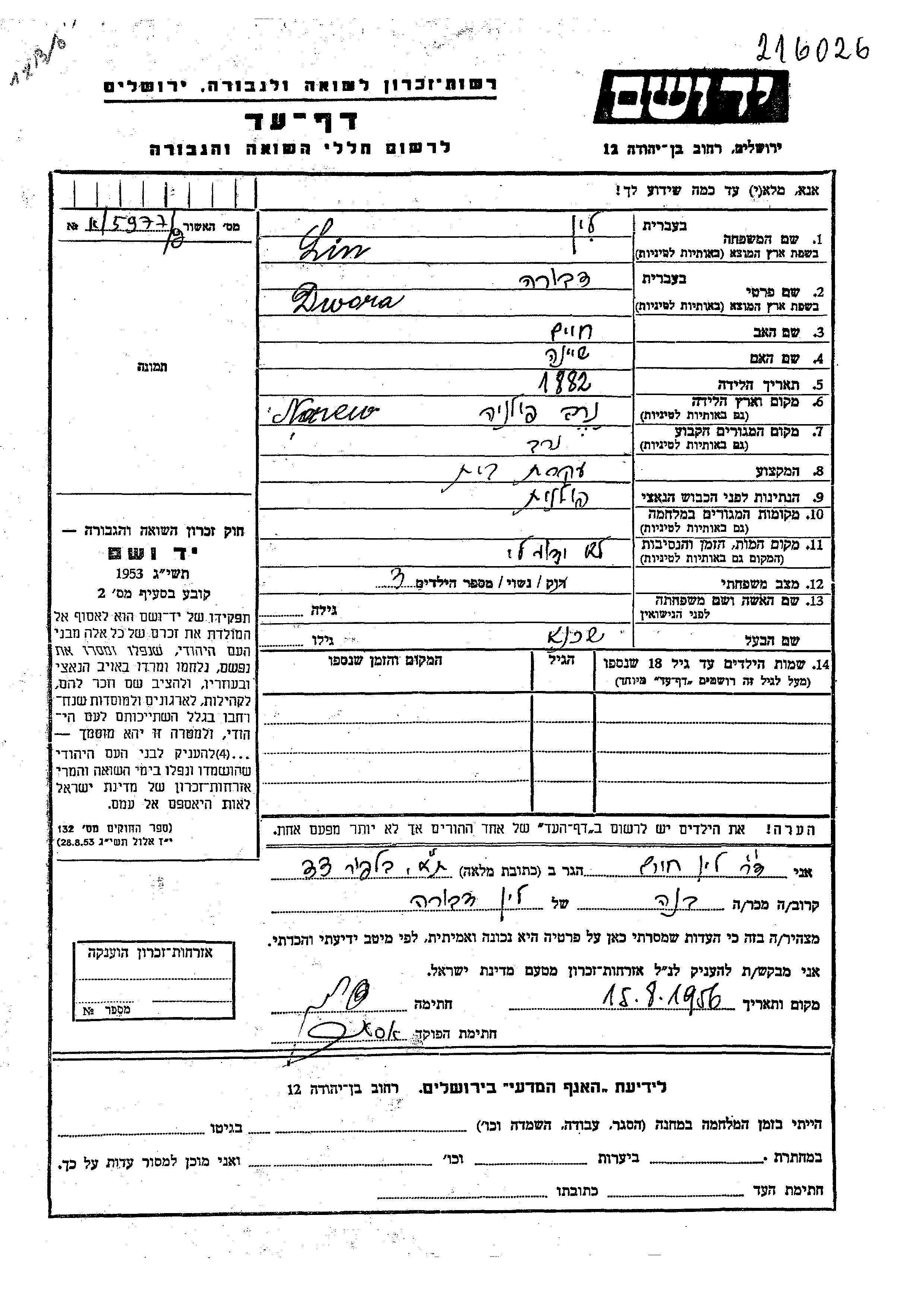 Lin Dwora 1882 Narew, Poland Page of Testimony