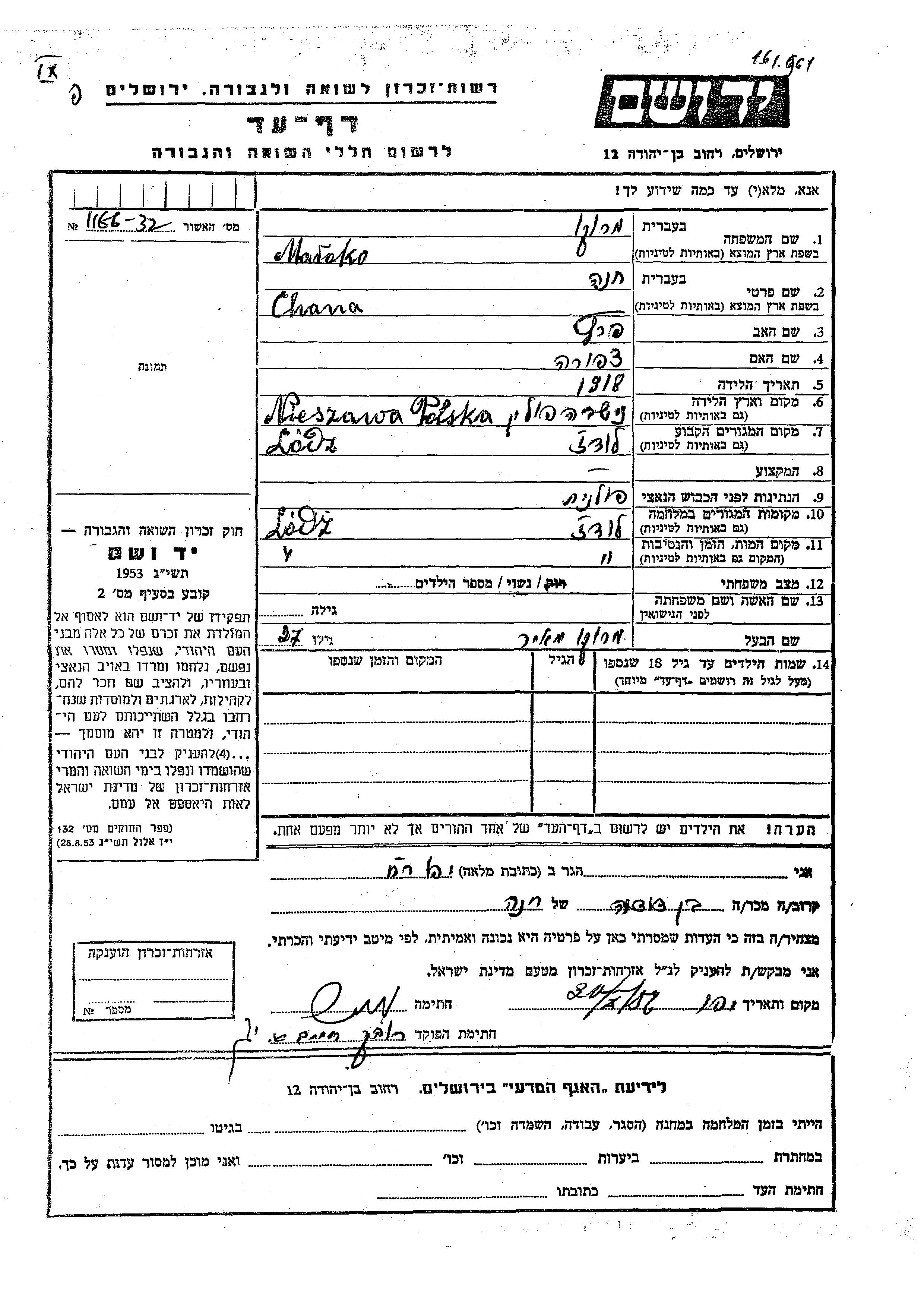 Chana Maroko was born in Nieszawa, Poland, 1918 to Peretz and Tzipora. She was married to Meir. Prior to WWII she lived in Lodz, Poland. During the war she was in Lodz, Poland. Chana was murdered in the Shoah. Place of death: Lodz, Poland.