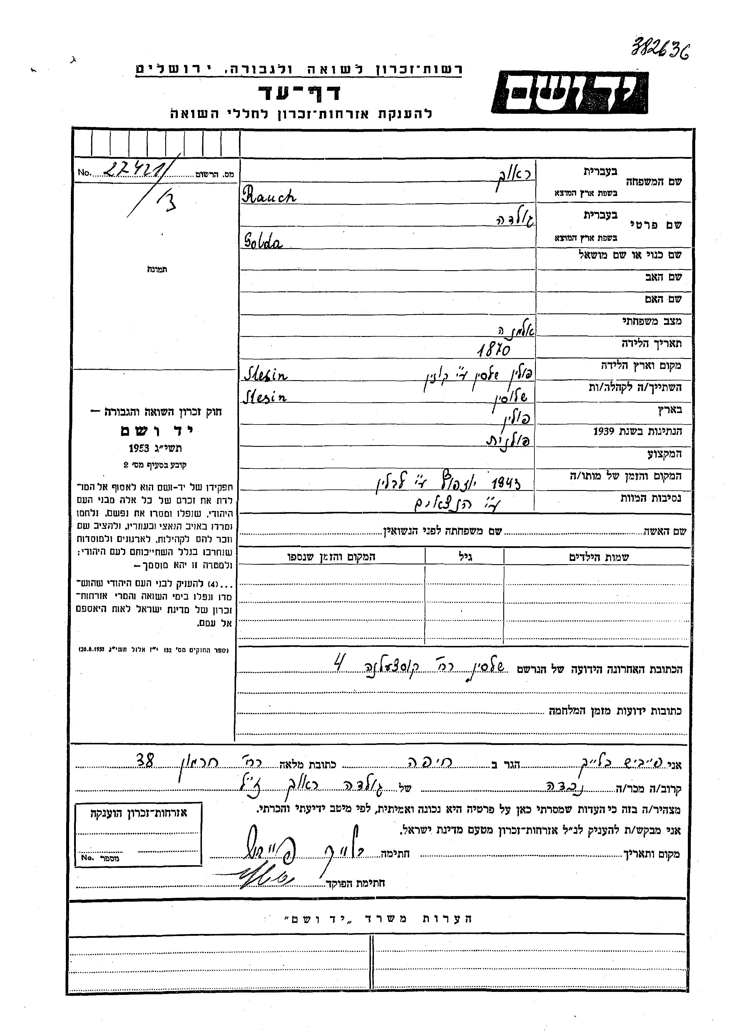 Golda Rauch was born in Slesin, Poland, 1870. She was a widow. During the war she was in Slesin, Poland.
