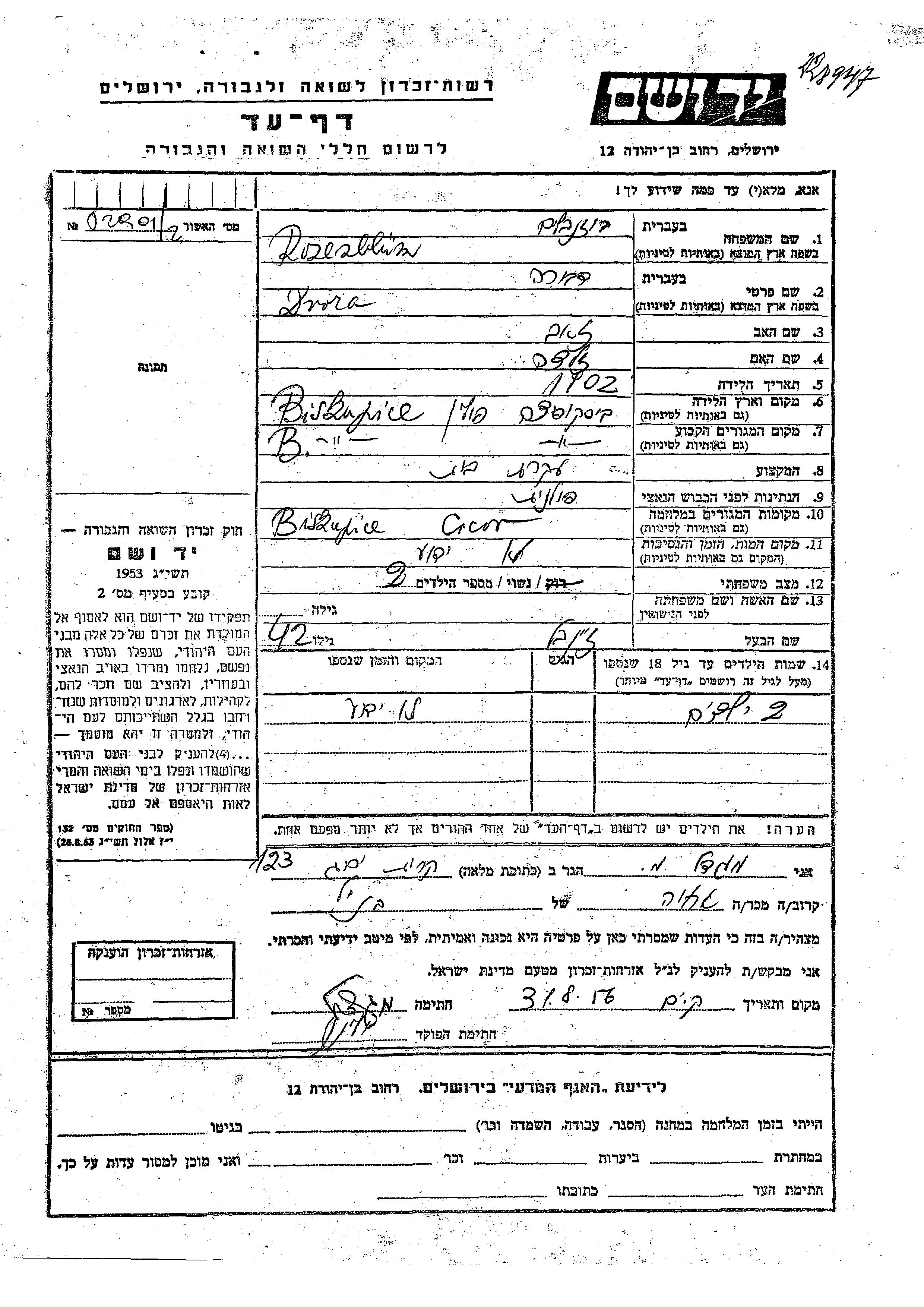 Dvora Rozenblum was born in Biskupice, Poland, 1902 to Zeev and Zelda. She was a housewife and married to Zainvel. Prior to WWII she lived in Biskupice, Poland. During the war she was in Biskupice, Poland. Dvora was murdered in the Shoah.