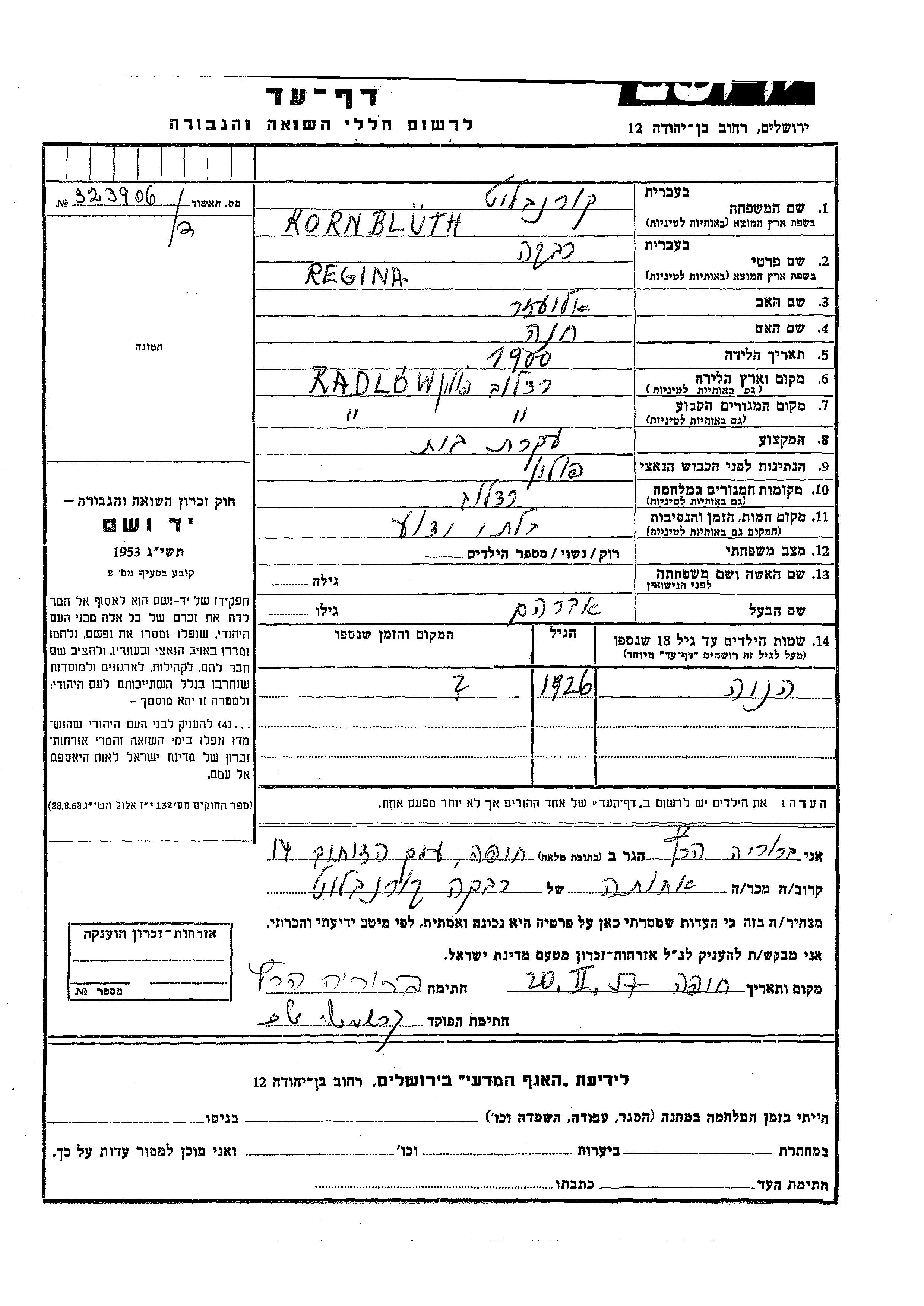 Regina Rivka Kornbluth was born in Radlow, Poland, 1900 to Eliezer and Khana. She was a housewife. Prior to WWII she lived in Radlow, Poland. During the war she was in Radlow, Poland. Regina Rivka was murdered in the Shoah.