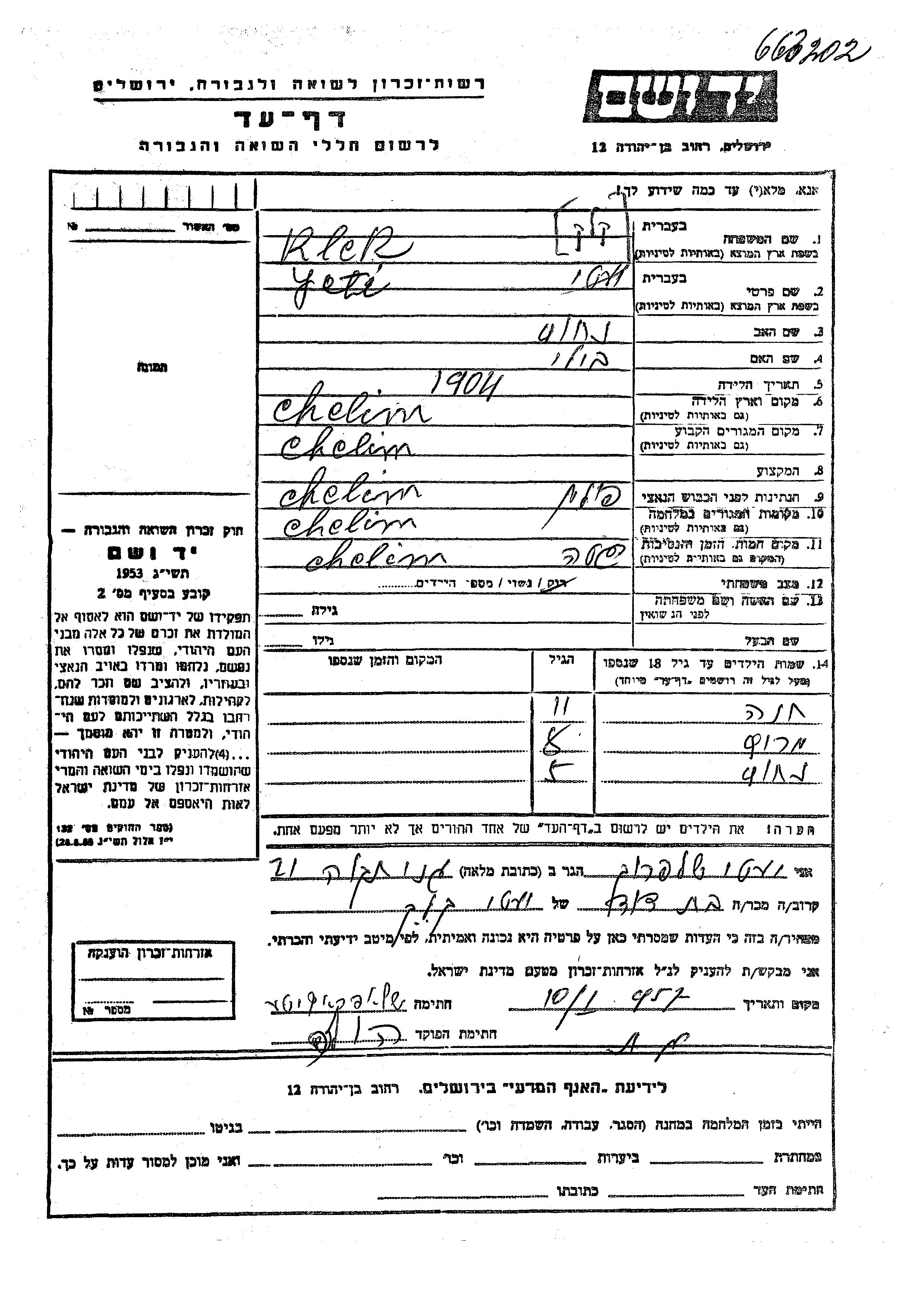 Klek Kalk Ita 1904 Chelim, Poland Page of Testimony