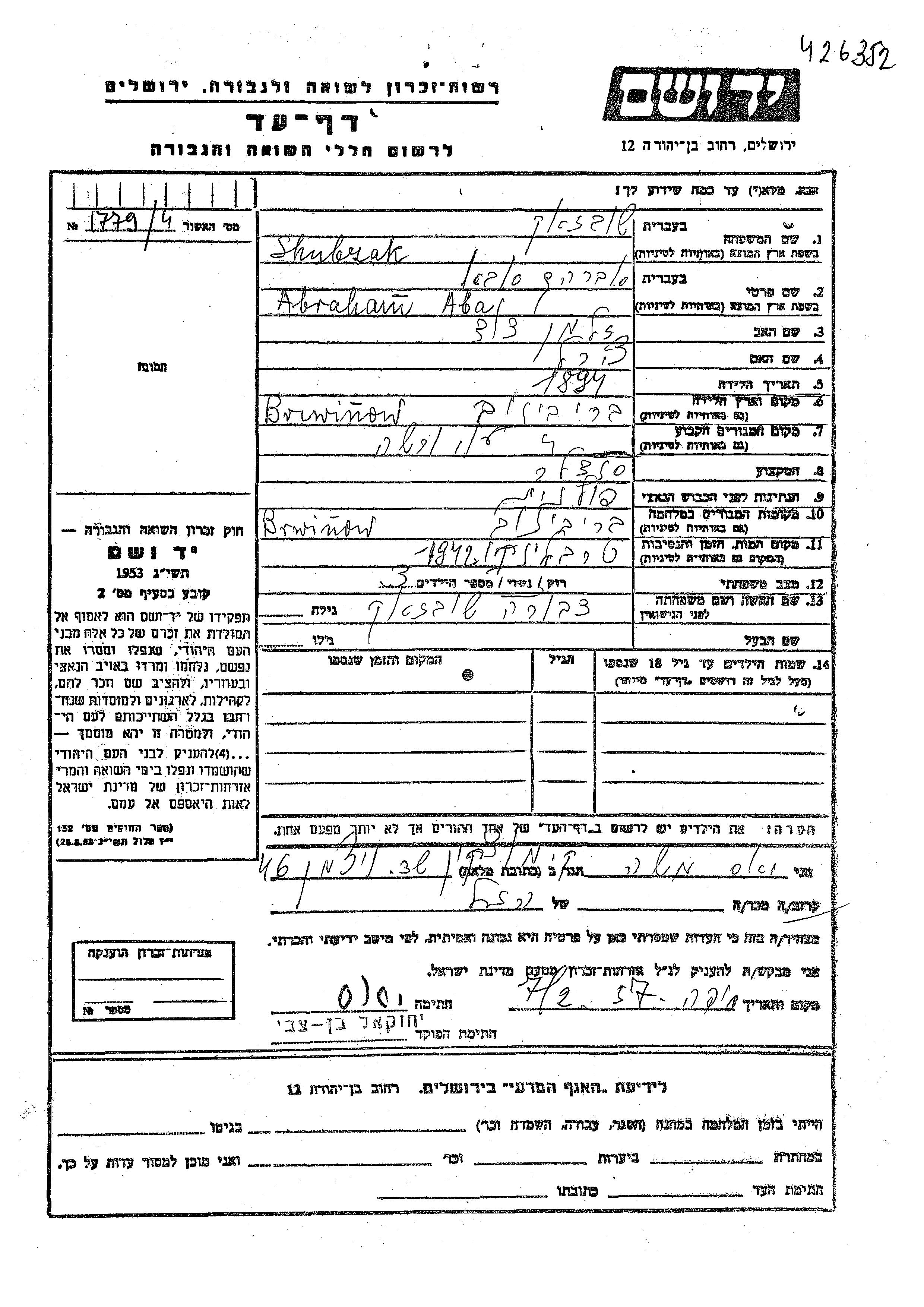 Abraham Aba Shubzak was born in Brwinow, Poland, 1894 to Zalman David and Tzirel. He was a shoemaker and married to Dvora. Prior to WWII he lived in Brwinow, Poland. During the war he was in Brwinow, Poland. Abraham Aba was murdered in the Shoah. Place of death: Treblinka, Poland, 1942.