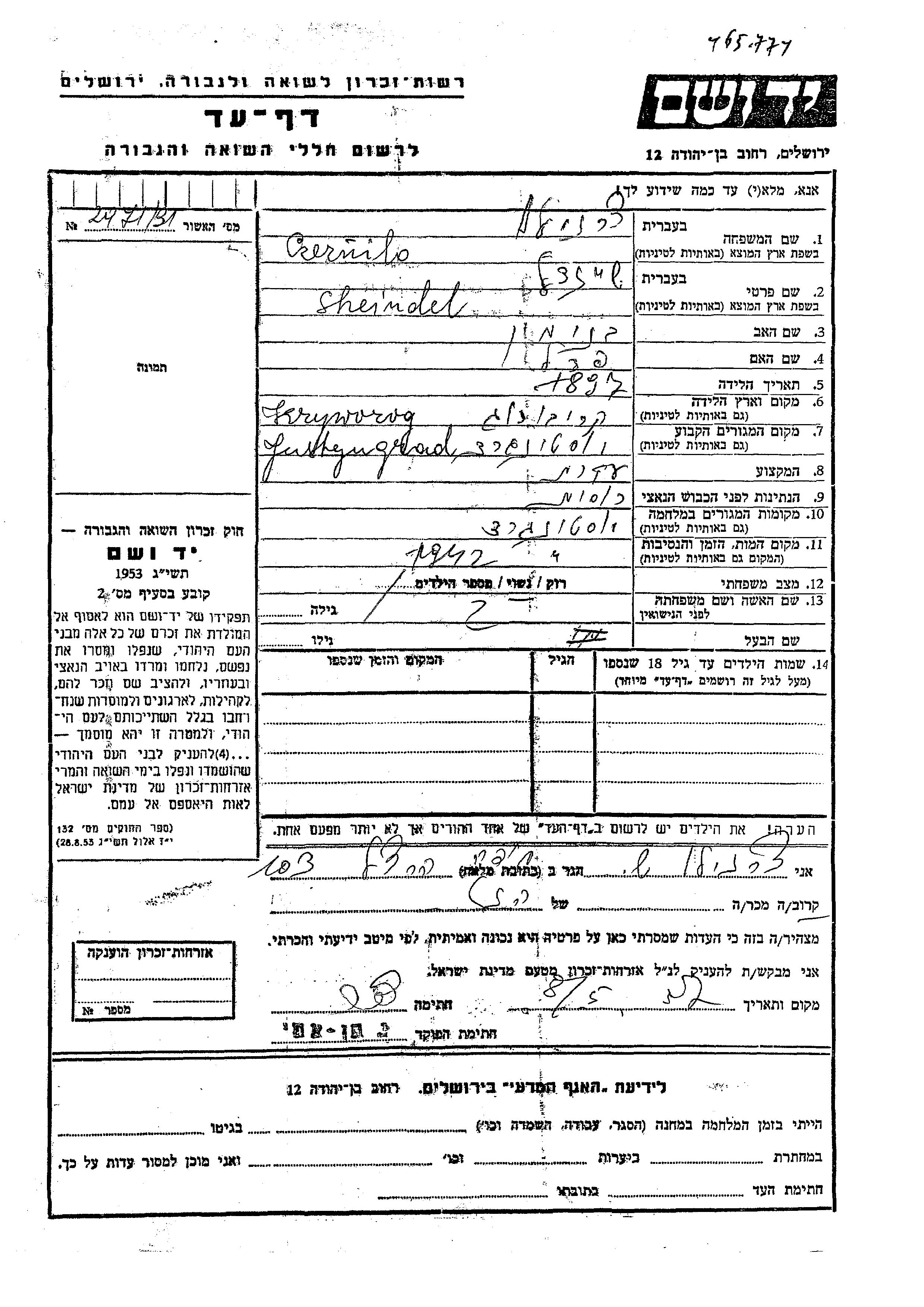 Sheindl Czernilo was born in Kryworog, Ukraine (USSR), 1897 to Beniamin and Perel. She was a housewife and married. Prior to WWII she lived in Justingrad, Ukraine (USSR). During the war she was in Justingrad, Ukraine (USSR). Sheindl was murdered in the Shoah. Place of death: Justingrad, Ukraine (USSR), 1942.