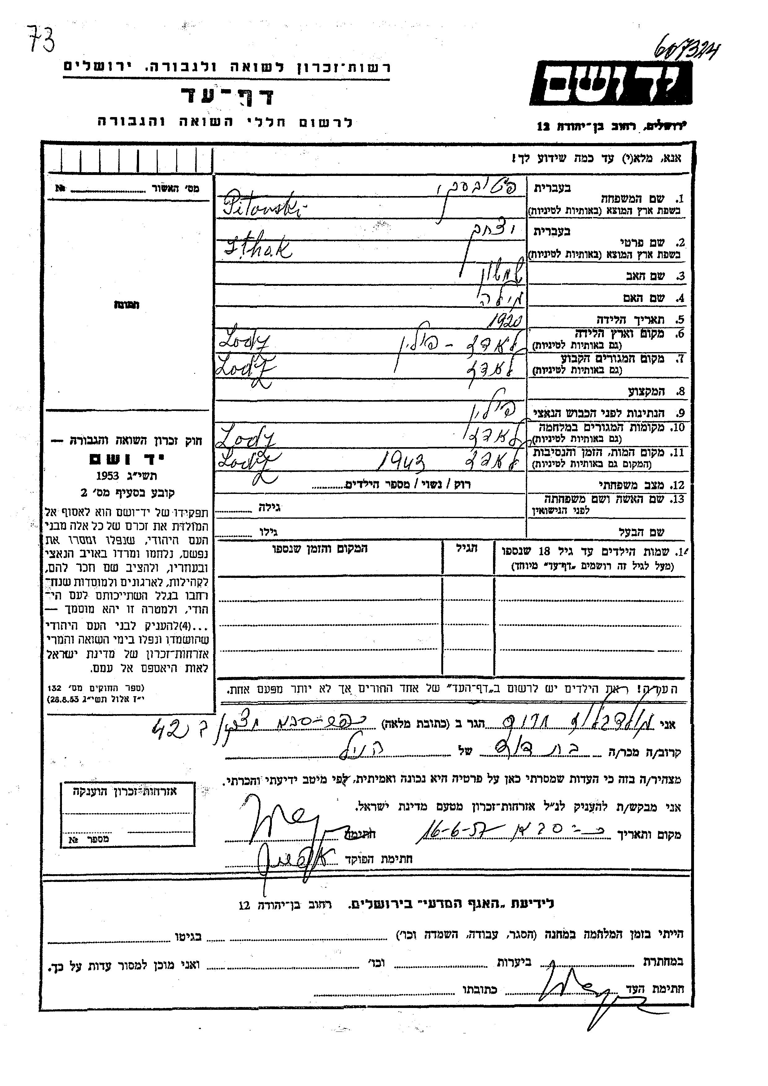 Ithak Pitovski was born in Lodz, Poland, 1920 to Shimshon and Gila. Prior to WWII he lived in Lodz, Poland. During the war he was in Lodz, Poland.