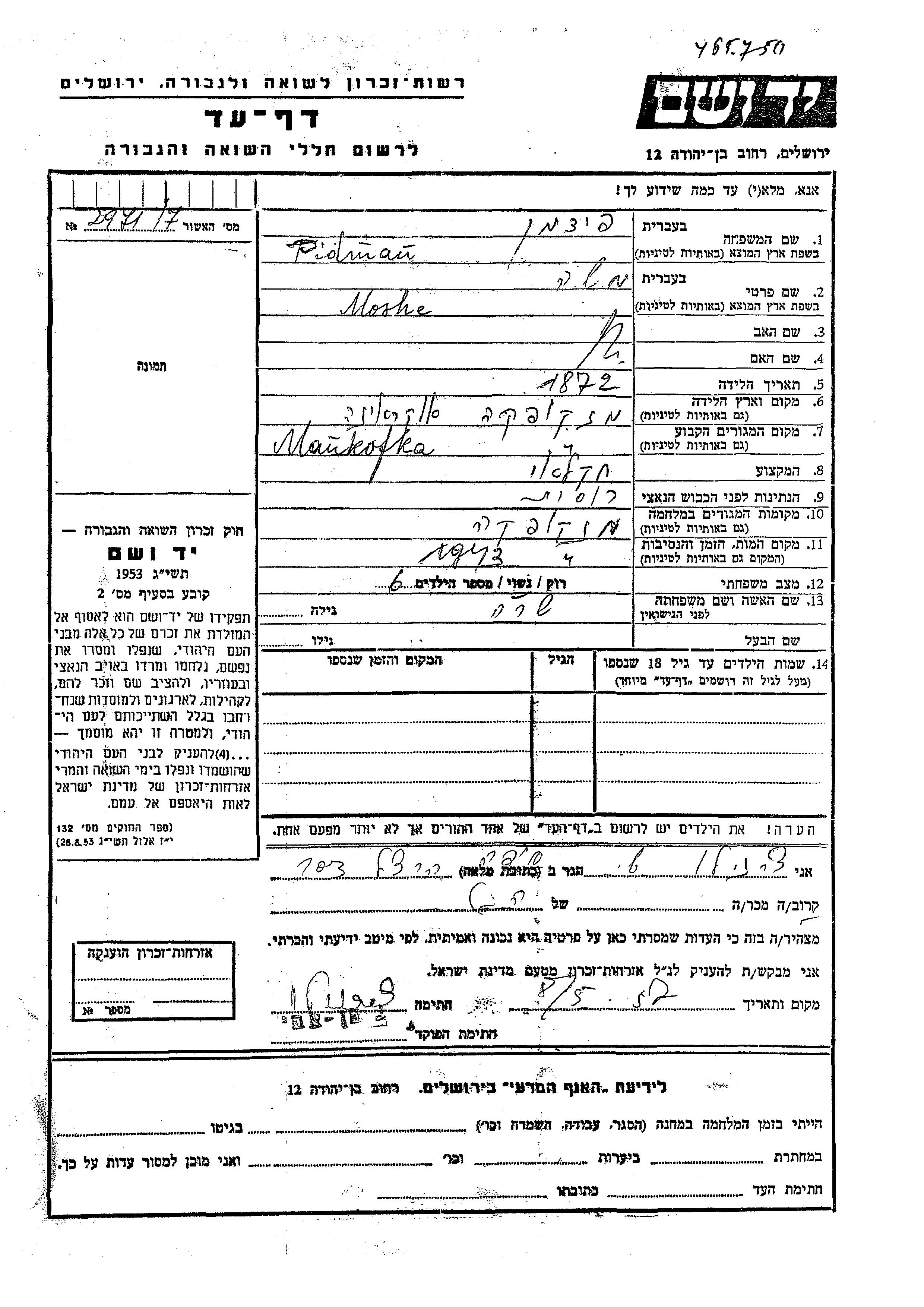 Moshe Pichman was born in Mankovka, Ukraine (USSR), 1872. He was an agriculturist and married to Sara. Prior to WWII he lived in Mankovka, Ukraine (USSR). During the war he was in Mankovka, Ukraine (USSR). Moshe was murdered in the Shoah. Place of death: Mankovka, Ukraine (USSR), 1943.