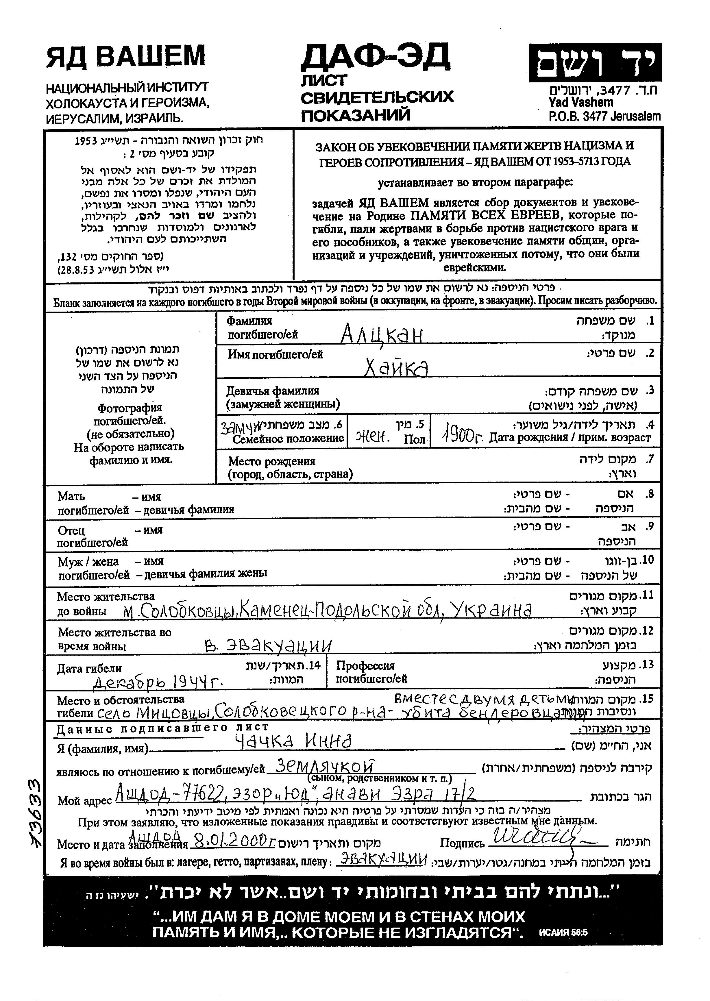 Altzkan Khaika 1900 Solobkovtsy, Ukraine (USSR) Page of Testimony