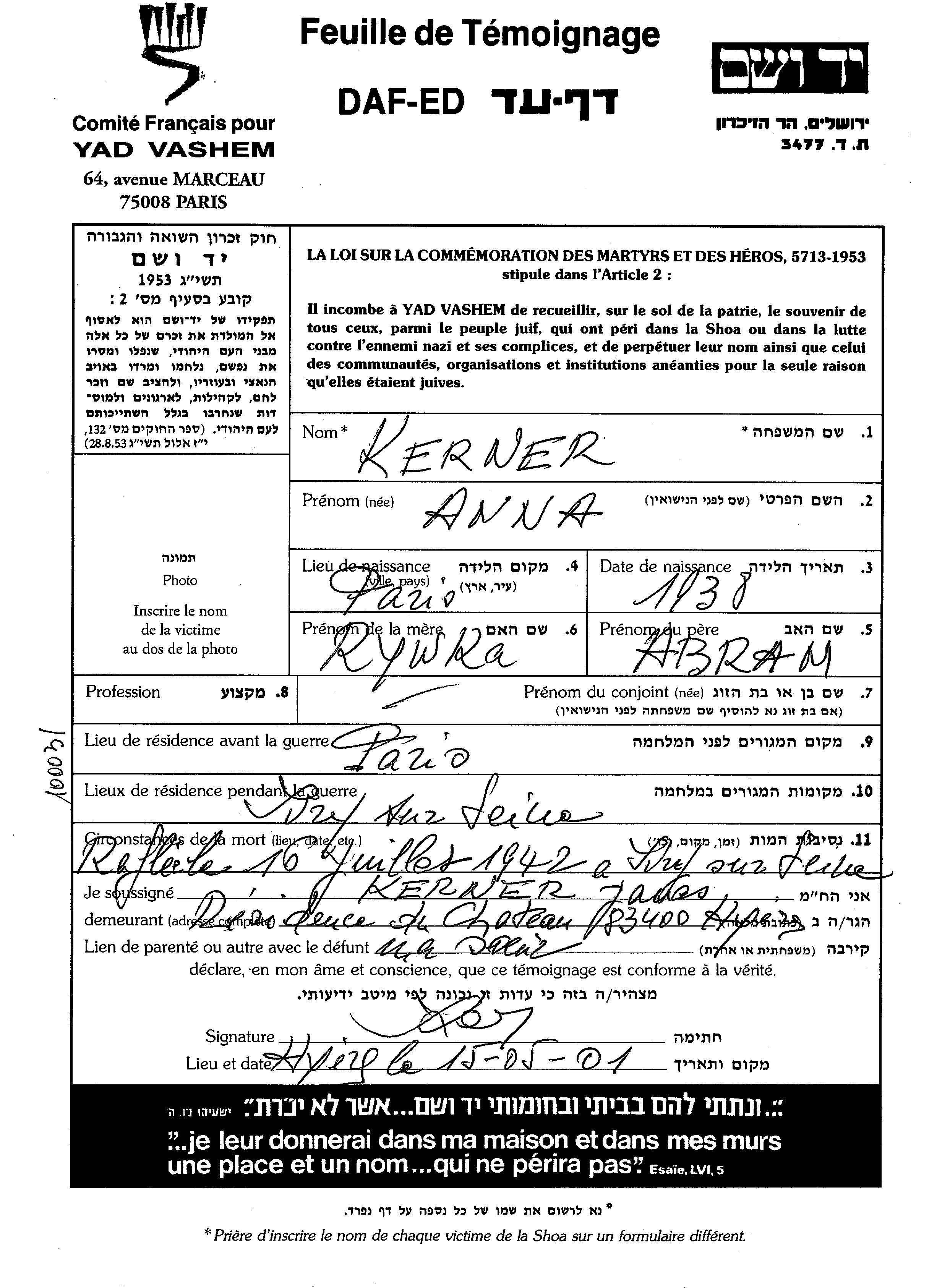 Anna Kerner was born in Paris, France, 1938 to Abram and Rywka. Prior to WWII she lived in Paris, France. During the war she was in Ivry sur Seine, France.