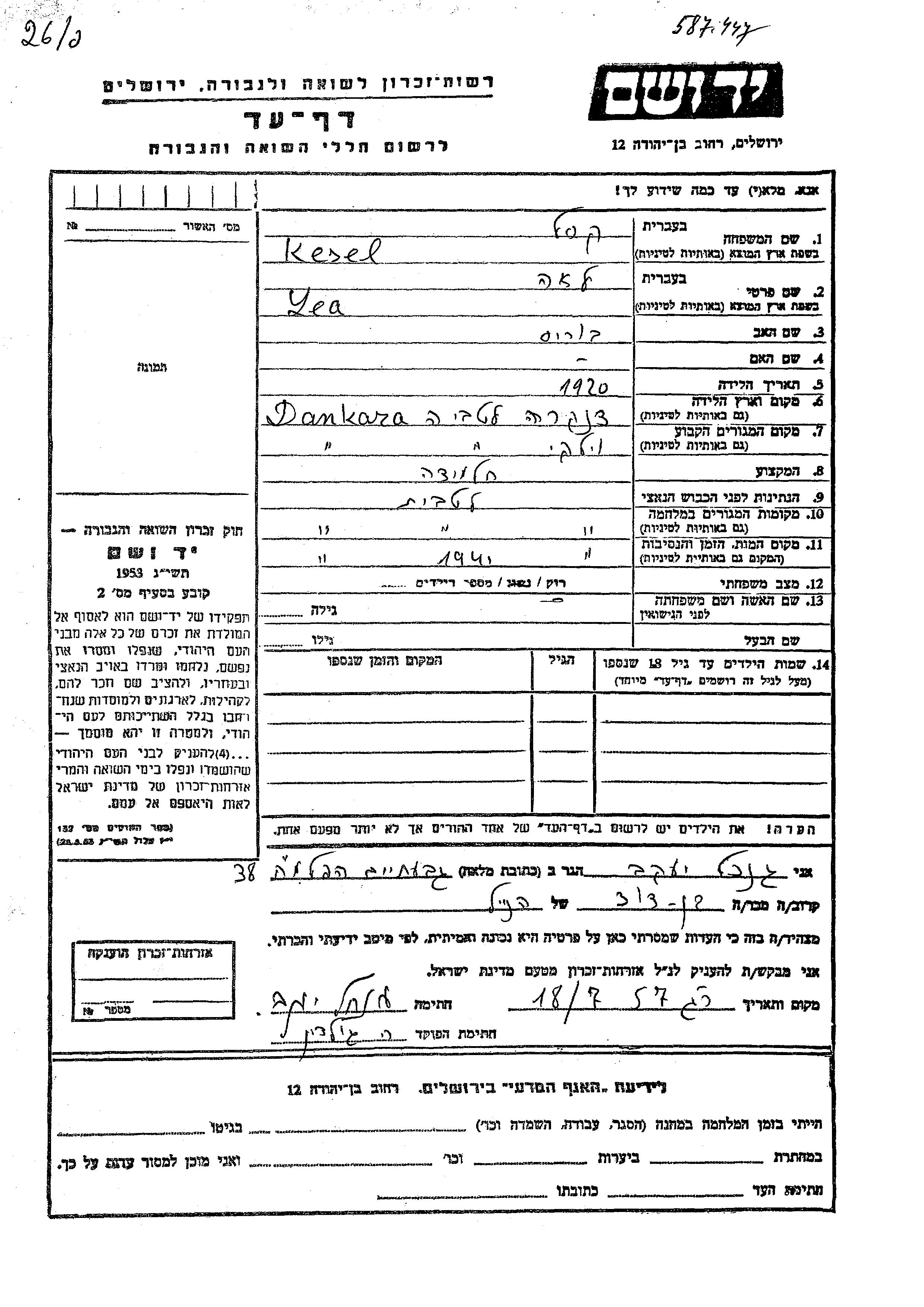 Kesel Lea 1920 Dankara, Latvia Page of Testimony