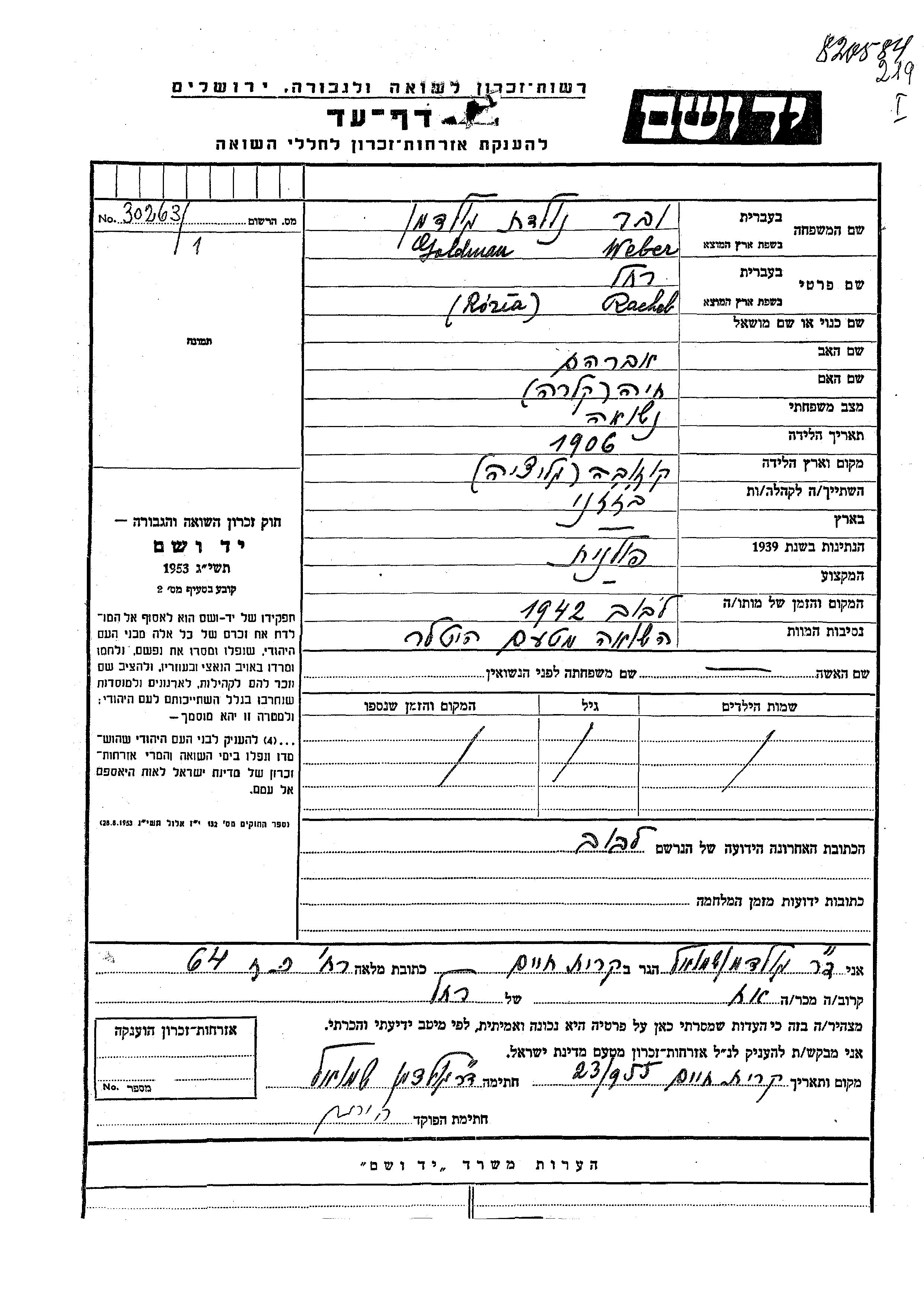 Weber Vaver Rachel Rozia 1906 Brzeżany, Poland Page of Testimony