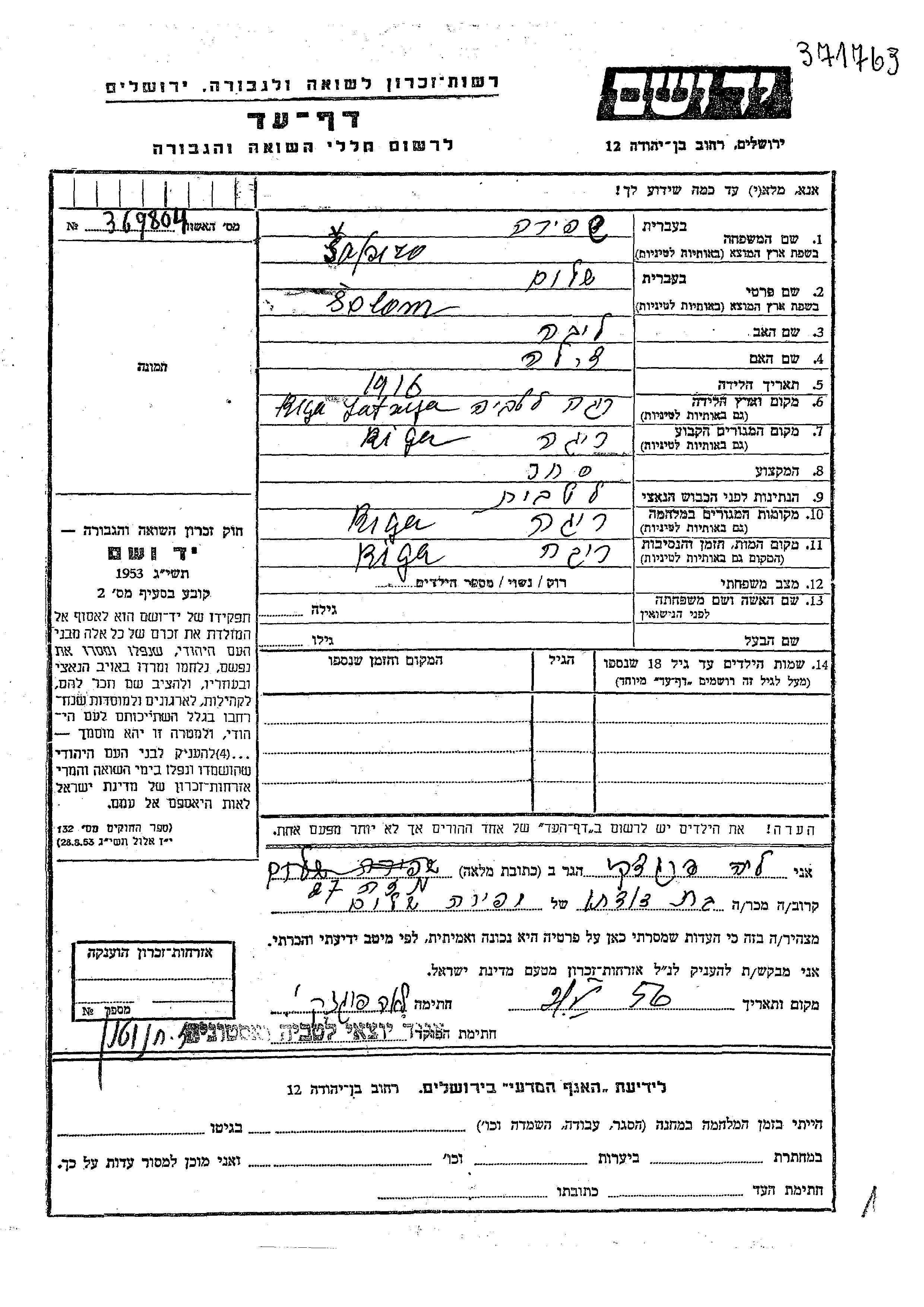 Salom was murdered in the Shoah. Place of death: Riga, Latvia.